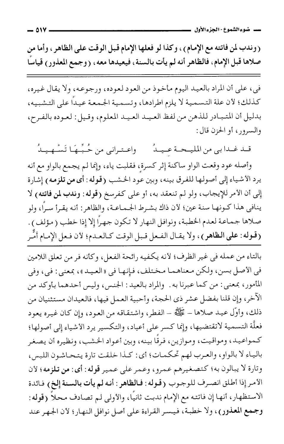 بالتاء من عمله فى غير الظرف؛ لأنه يكفيه رائحة الفعل، وكأنه فر من تعلق اللامين فى الاصل بسن، ولكن معناهما مختلف، فإنها فى "العيد"، بمعنى: في، وفى المأمور، بمعنى: من كما عبرنا به. والمراد بالعيد: الجنس، وليس أحدهما بأوكد من الآخر، وإن قلنا بفضل عشر ذى الحجة، وأحبية العمل فيها، فالعيدان مستثنيان من ذلك، وأوّل عيد صلاها - صلى الله عليه وسلم - الفطر، واشتقاقه من العود، وإن كان غيره يعود فعلَّة التسمية لا تقتضيها، وإنما كسر على أعياد، والتكسير يرد الأشياء إلى أصولها؛ كمواعيد، ومواقيت، وموازين، فرقًا بينه، وبين أعواد الخشب، ونظيره أن يصغر بالياء لا بالواو، والعرب لهم تحكمات؛ أي: كذا خلقت تارة يتحاشون اللبس، وتارة لا يبالون به؛ كتصغيرهم عمرو، وعمر على عمير قوله: أي: من تلزمه؛ لأن الأمر إذا أطلق انصرف للوجوب (قوله: فالظاهر: أنه لم يأت بالسنة إلخ) فائدة الاستظهار، أنها إن فاتته مع الإمام ندبت ثانيًا، والأولى لم تصادف محلًا (قوله: وجمع المعذور)، ولا خطبة، فيسر القراءة على أصل نوافل النهار؛ لأن الجهر عند