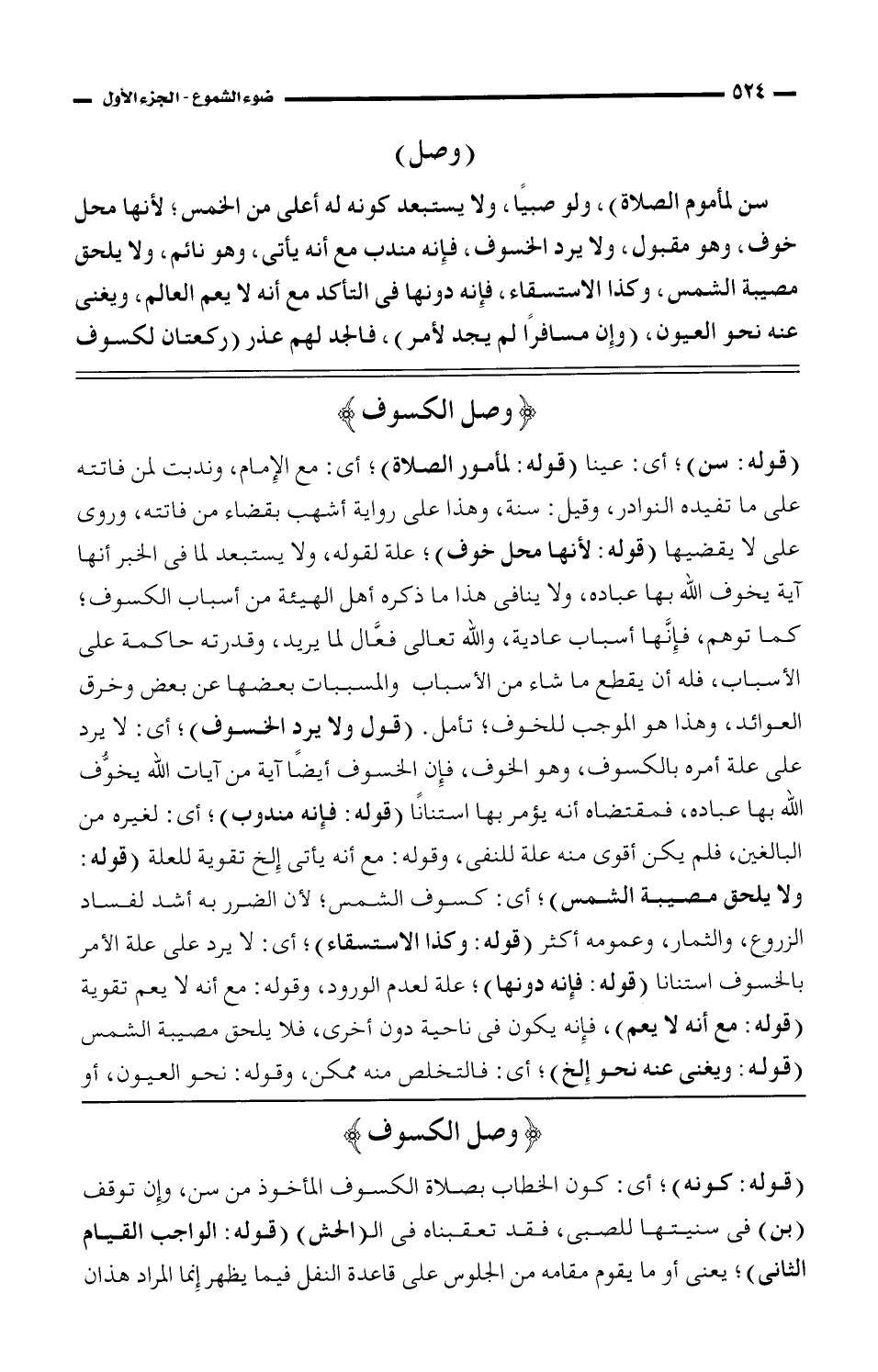 سن لمأموم الصلاة)، ولو صبيًا، ولا يستبعد كونه له أعلى من الخمس؛ لأنها محل خوف، وهو مقبول، ولا يرد الخسوف، فإنه مندب مع أنه يأتي، وهو نائم، ولا يلحق مصيبة الشمس، وكذا الاستسقاء، فإنه دونها فى التأكد مع أنه لا يعم العالم، ويغنى عنه نحو العيون، (وإن مسافرًا لم يجد لأمر)، فالجد لهم عذر (ركعتان لكسوف
