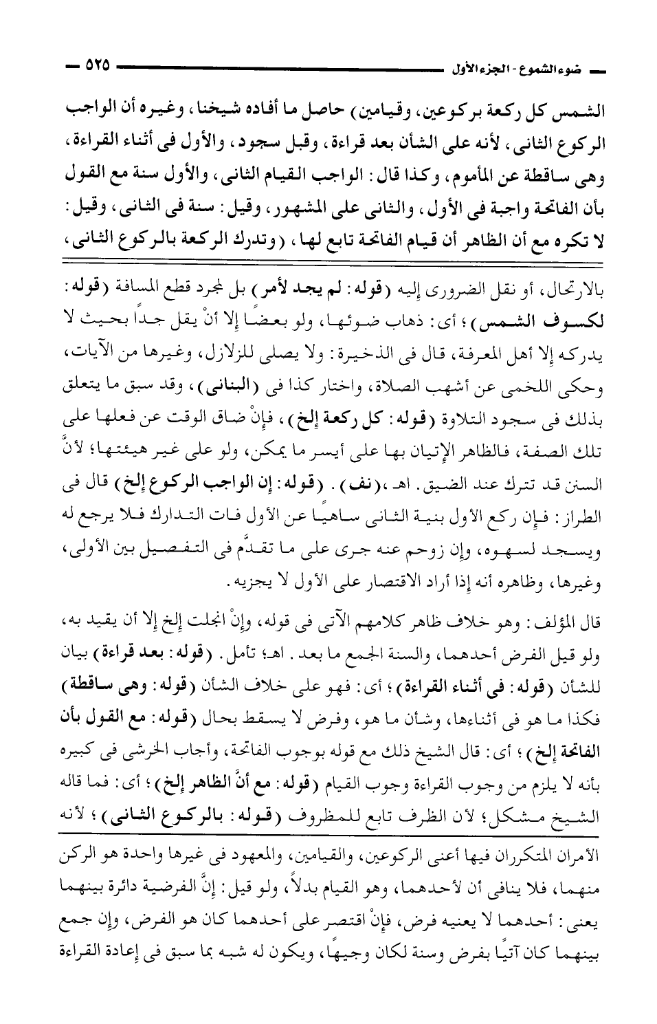 الشمس كل ركعة بركوعين، وقيامين) حاصل ما أفاده شيخنا، وغيره أن الواجب الركوع الثاني، لأنه على الشأن بعد قراءة، وقبل سجود، والأول فى أثناء القراءة، وهى ساقطة عن المأموم، وكذا قال: الواجب القيام الثاني، والأول سنة مع القول بأن الفاتحة واجبة فى الأول، والثانى على المشهور، وقيل: سنة فى الثاني، وقيل: لا تكره مع أن الظاهر أن قيام الفاتحة تابع لها، (وتدرك الركعة بالركوع الثاني،