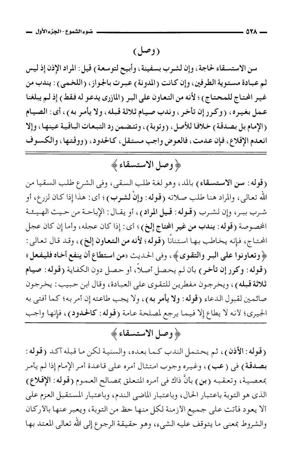 (قوله: سن الاستسقاء) بالمد، وهو لغة طلب السقي، وفى الشرع طلب السقيا من الله تعالى، والمراد هنا طلب صلاته (قوله: وإن لشرب)؛ أي: هذا إذا كان لزرع، أو شرب ببر، وإن لشرب (قوله: قيل المراد)، أو يقال: الإباحة من حيث الهيئة المخصوصة (قوله: يندب من غير المحتاج إلخ)؛ أي: إذا كان عجله، وأما إن كان عجل المحتاج، فإنه يخاطب بها استنانًا (قوله؛ لأنه من التعاون إلخ)، وقد قال تعالى: {وتعاونوا على البر والتقوى}، وفى الحديث "من استطاع أن ينفع أخاه فليفعل" (قوله: وكرر إن تأخر) بأن لم يحصل أصلًا، أو حصل دون الكفاية (قوله: صيام ثلاثة قبله)، ويخرجون مفطرين للتقوى على العبادة، وقال ابن حبيب: يخرجون صائمين لقبول الدعاء (قوله: ولا يأمر به)، ولا يجب طاعته إن أمر به؛ كما أفتى به الجيري؛ لأنه لا يطاع إلا فيما يرجع لمصلحة عامة (قوله: كالحدود)، فإنها واجب