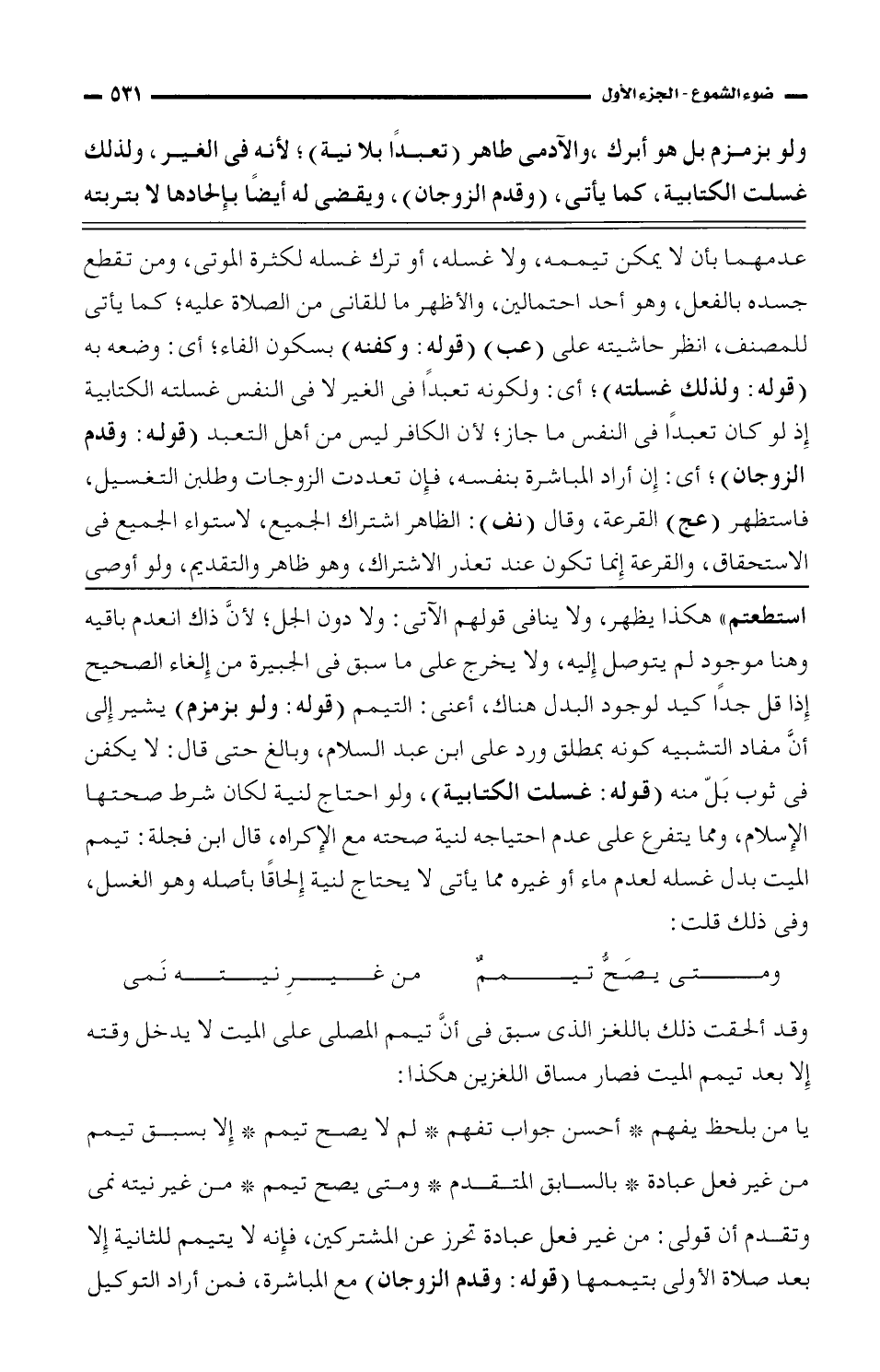 استطعتم" هكذا يظهر، ولا ينافى قولهم الآتي: ولا دون الجل؛ لأنَّ ذاك انعدام باقيه وهنا موجود لم يتوصل إليه، ولا يخرج على ما سبق فى الجبيرة من إلغاء الصحيح إذا قل جدًا كيد لوجود البدل هناك، أعني: التيمم (قوله: ولو بزمزم) يشير إلى أنَّ مفاد التشبيه كونه بمطلق ورد على ابن عبد السلام، وبالغ حتى قال: لا يكفن فى ثوب بلّ منه (قولت: غسلت الكتابية)، ولو احتاج لنية لكان شرط صحتها الإسلام، ومما يتفرع على عدم احتياجه لنية صحته مع الإكراه، قال ابن فجلة: تيمم الميت بدل غسله لعدم ماء أو غيره مما يأتى لا يحتاج لنية إلحاقًا بأصله وهو الغسل، وفى ذلك قلت: