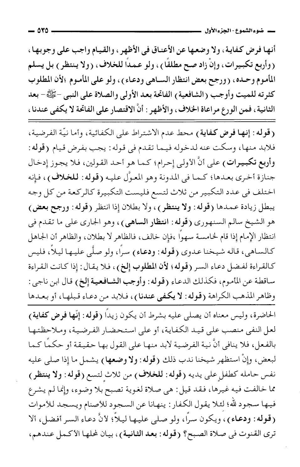 الحاضرة، وليس معناه أن يصلى عليه بشرط أن يكون زيدًا (قوله: إنّها فرض كفاية) لعل النفى منصب على قيد الكفاية، أو على استحضار الفرضية، وملاحظتها بالفعل، فلا ينافى أنَّ نية الفرضية لابد منها على القول بها حقيقة أو حكمًا كما لبعض، وإن استظهر شيخنا ندب ذلك (قوله: ولا وضعها) يشمل ما إذا صلى عليه نفس حامله كطفلٍ على يديه (قوله: للخلاف) من ثلاثٍ لتسع (قوله: ولا ينتظر) مما خالفت فيه غيرها، فقد قيل: هى صلاة لغوية تصبح بلا وضوء، وإنما لم يشرع فيها سجود لله؛ لئلا يقول الكفار: ينهانا عن السجود للأصنام ويسجد للأموات (قوله: ودعاء)، ويكون سرًا، ولو صلى عليها ليلًا؛ لأنَّ دعاء السر أفضل، ألا ترى القنوت فى صلاة الصبح؟ (قوله: بعد الثانية)، بيان لمحلها الأكمل عندهم،