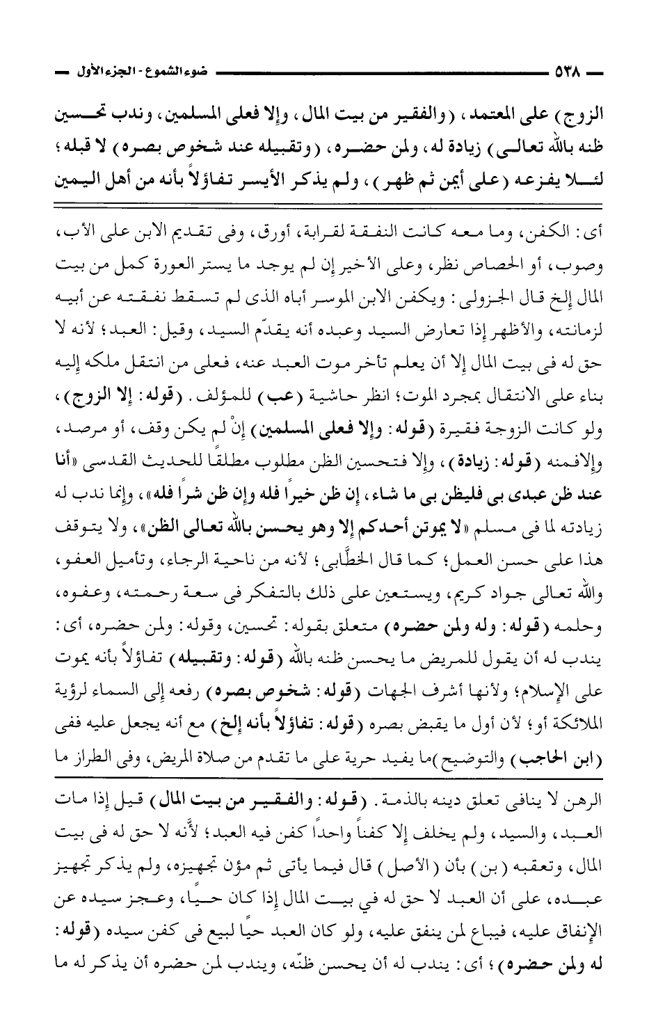 أي: الكفن، وما معه كانت النفقة لقرابة، أورق، وفى تقديم الابن على الأب، وصوب، أو الحصاص نظر، وعلى الأخير إن لم يوجد ما يستر العورة كمل من بيت المال إلخ قال الجزولي: ويكفن الابن الموسر أباه الذى لم تسقط نفقته عن أبيه لزمانته، والأظهر إذا تعارض السيد وعبده أنه يقدّم السيد، وقيل: العبد؛ لأنه لا حق له فى بيت المال إلا أن يعلم تأخر موت العبد عنه، فعلى من انتقل ملكه إليه بناء على الانتقال بمجرد الموت؛ انظر حاشية (عب) للمؤلف. (قوله: إلا الزوج)، ولو كانت الزوجة فقيرة (قوله: وإلا فعلى المسلمين) إن لم يكن وقف، أو مرصد، وإلا فمنه (قوله: زيادة)، وإلا فتحسين الظن مطلوب مطلقًا للحديث القدسى "أنا عند ظن عبدى بى فليظن بى ما شاء، إن ظن خيرًا فله وإن ظن شرًا فله"، وإنما ندب له زيادته لما فى مسلم "لا يموتن أحدكم إلا وهو يحسن بالله تعالى الظن"، ولا يتوقف هذا على حسن العمل؛ كما قال الخطَّابي؛ لأنه من ناحية الرجاء، وتأميل العفو، والله تعالى جواد كريم، ويستعين على ذلك بالتفكر فى سعة رحمته، وعفوه، وحلمه (قوله: وله ولمن حضره) متعلق بقوله: تحسين، وقوله: ولمن حضره، أي: يندب له أن يقول للمريض ما يحسن ظنه بالله (قوله: وتقبيله) تفاؤلًا بأنه يموت على الإسلام؛ ولأنها أشرف الجهات (قوله: شخوص بصره) رفعه إلى السماء لرؤية الملائكة أو؛ لأن أول ما يقبض بصره (قوله: تفاؤلًا بأنه إلخ) مع أنه يجعل عليه ففى (ابن الحاجب) والتوضيح ما يفيد حرية على ما تقدم من صلاة المريض، وفى الطراز ما