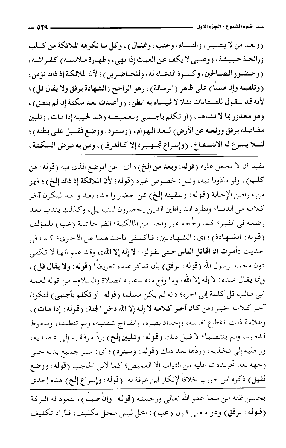 يفيد أن لا يجعل عليه (قوله: وبعد من إلخ)؛ أي: عن الموضع الذى فيه (قوله: من كلب)، ولو مأذونًا فيه، وقيل: خصوص غيره (قوله؛ لأن الملائكة إذ ذاك إلخ)؛ فهو من مواطن الإجابة (قوله: وتلقينه إلخ) ممن حضر واحد، بعد واحد ليكون آخر كلامه من الدنيا؛ ولطرد الشياطين الذين يحضرون للتبديل، وكذلك يندب بعد وضعه فى القبر؛ كما رجَّحه غير واحد من المالكية؛ انظر حاشية (عب) للمؤلف (قوله: الشهادة)؛ أي: الشهادتين، فاكتفى بأحداهما عن الأخرى؛ كما فى حديث "أمرت أن أقاتل الناس حتى يقولوا: لا إله إلا الله"، وقد علم أنها لا تكفى دون محمد رسول الله (قوله: برفق) بأن تذكر عنده تعريضًا (قوله: ولا يقال قل)، وإنما يقال عنده: لا إله إلا الله، وما وقع منه - عليه الصلاة والسلام - من قوله لعمه أبى طالب قل كلمة إلى آخره؛ لأنه لم يكن مسلما (قوله: أو تكلم بأجنبي) لتكون آخر كلامه لخبر "من كان آخر كلامه لا إله إلا الله دخل الجنة" (قوله: إذا مات)، وعلامة ذلك انقطاع نفسه، وإحداد بصره، وانفراج شفتيه، ولم تنطبقا، وسقوط قدميه، ولم ينتصبا؛ لا قبل ذلك (قوله: وتليين إلخ) بردّ مرفقيه إلى عضديه، ورجليه إلى فخذيه، وردّها بعد ذلك (قوله: وستره)؛ أي: ستر جميع بدنه حتى وجهه بعد تجريده مما عليه من الثياب إلا القميص؛ كما لابن الحاجب (قوله: ووضع ثقيل) ذكره ابن حبيب خلافًا لإنكار ابن عرفة له (قوله: وإسراع إلخ) هذه إحدى