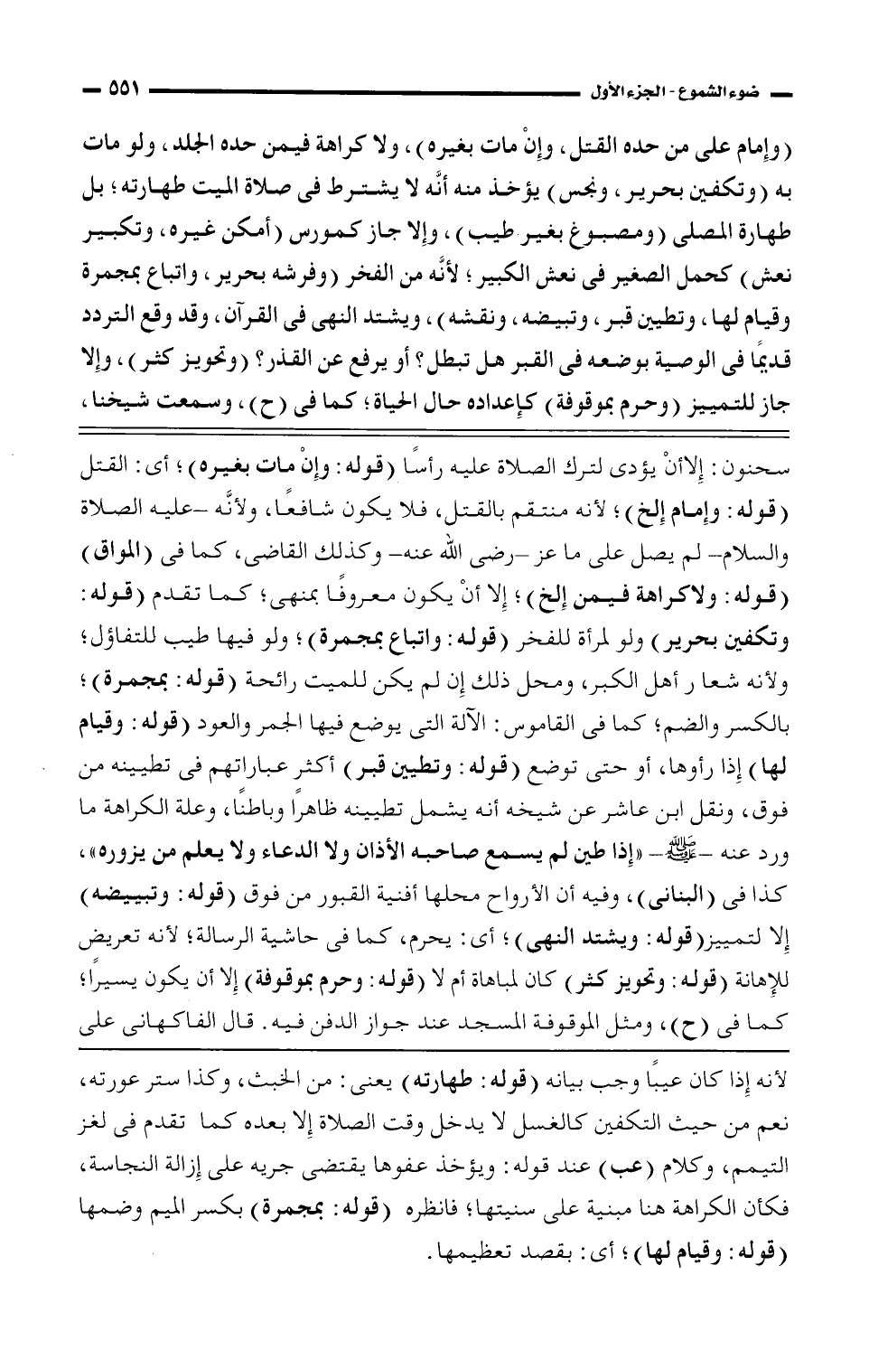 سحنون: إلا أن يؤدى لترك الصلاة عليه رأسًا (قوله: وإن مات بغيره)؛ أي: القتل (قوله: وإمام إلخ)؛ لأنه منتقم بالقتل، فلا يكون شافعًا، ولأنَّه - عليه الصلاة والسلام - لم يصل على ما عز - رضى الله عنه - وكذلك القاضي، كما فى (المواق) (قوله: ولا كراهة فيمن إلخ)؛ إلا أن يكون معروفًا بمنهى؛ كما تقدم (قوله: وتكفين بحرير) ولو لمرأة للفخر (قوله: واتباع بمجمرة)؛ ولو فيها طيب للتفاؤل؛ ولأنه شعار أهل الكبر، ومحل ذلك إن لم يكن للميت رائحة (قوله: بمجمرة)؛ بالكسر والضم؛ كما فى القاموس: الآلة التى يوضع فيها الجمر والعود (قوله: وقيام لها) إذا رأوها، أو حتى توضع (قوله: وتطيين قبر) أكثر عباراتهم فى تطيينه من فوق، ونقل ابن عاشر عن شيخه أنه يشمل تطيينه ظاهرًا وباطنًا، وعلة الكراهة ما ورد عنه - صلى الله عليه وسلم - "إذا طين لم يسمع صاحبه الأذان ولا الدعاء ولا يعلم من يزوره"، كذا فى (البناني)، وفيه أن الأرواح محلها أفنية القبور من فوق (قوله: وتبييضه) إلا لتمييز (قوله: ويشتد النهي)؛ أي: يحرم، كما فى حاشية الرسالة؛ لأنه تعريض للإهانة (قوله: وتحويز كثر) كان لمباهاة أم لا (قوله: وحرم بموقوفة) إلا أن يكون يسيرًا؛ كما فى (ح)، ومثل الموقوفة المسجد عند جواز الدفن فيه. قال الفاكهانى على