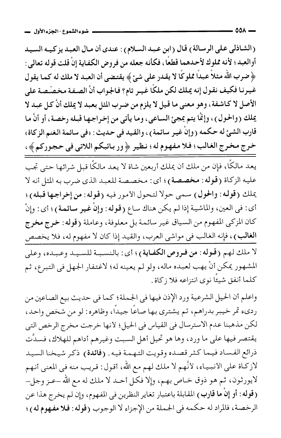 (الشاذلى على الرسالة) قال (ابن عبد السلام): عندى أن مال العبد يزكيه السيد أو العبد؛ لأنه مملوك لأحدهما قطعًا، فكأنه جعله من فروض الكفاية إن قلت قوله تعالى: {ضرب الله مثلًا عبدًا مملوكًا لا يقدر على شيء} يقتضى أن العبد لا ملك له كما يقول غيرنا فكيف نقول إنه يملك لكن ملكًا غير تام؟ فالجواب أنَّ الصفة مخصصة على الأصل لا كاشفة، وهو معنى ما قيل لا يلزم من ضرب المثل بعبد لا يملك أنَّ كل عبد لا يملك (والحول)، وإنَّما يتم بمجئ الساعي، وما يأتى من إخراجها قبله رخصة، أو أنَّ ما قارب الشيء له حكمه (وإن غير سائمة)، والقيد فى حديث: "فى سائمة الغنم الزكاة" خرج مخرج الغالب؛ فلا مفهوم له؛ نظير {وربائبكم اللاتى فى حجوركم}،