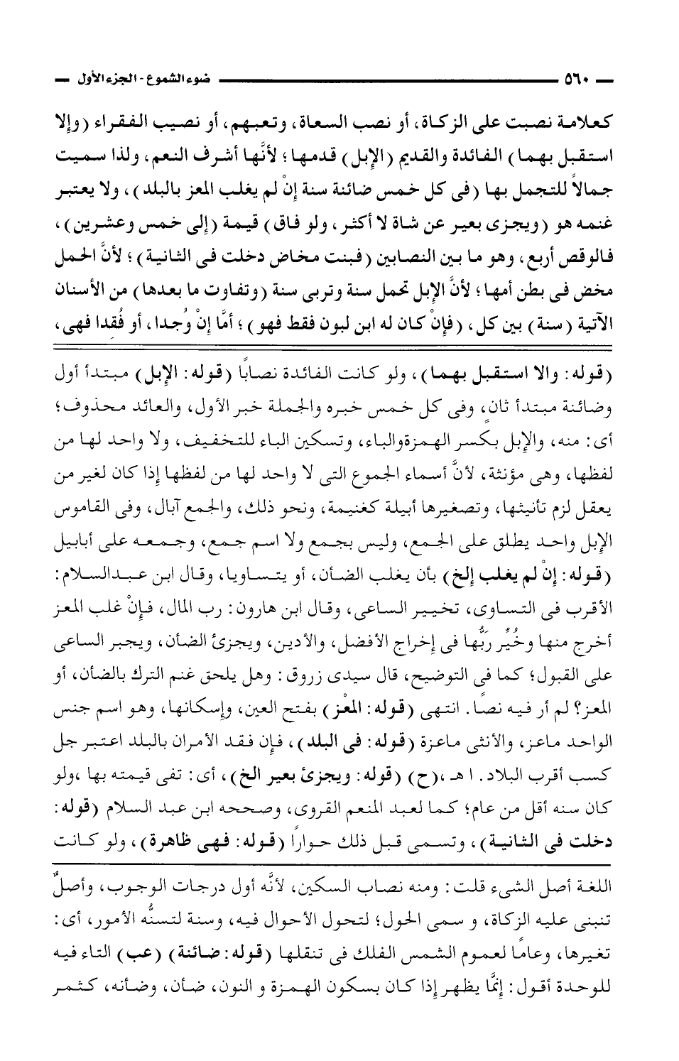 اللغة أصل الشيء قلت: ومنه نصاب السكين، لأنَّه أول درجات الوجوب، وأصلٌ تنبنى عليه الزكاة، وسمى الحول؛ لتحول الأحوال فيه، وسنة لتسنُّه الأمور، أي: تغيرها، وعامًا لعموم الشمس الفلك فى تنقلها (قوله: ضائنة) (عب) التاء فيه للوحدة أقول: إنَّما يظهر إذا كان بسكون الهمزة والنون، ضأن، وضأنه، كثمر
