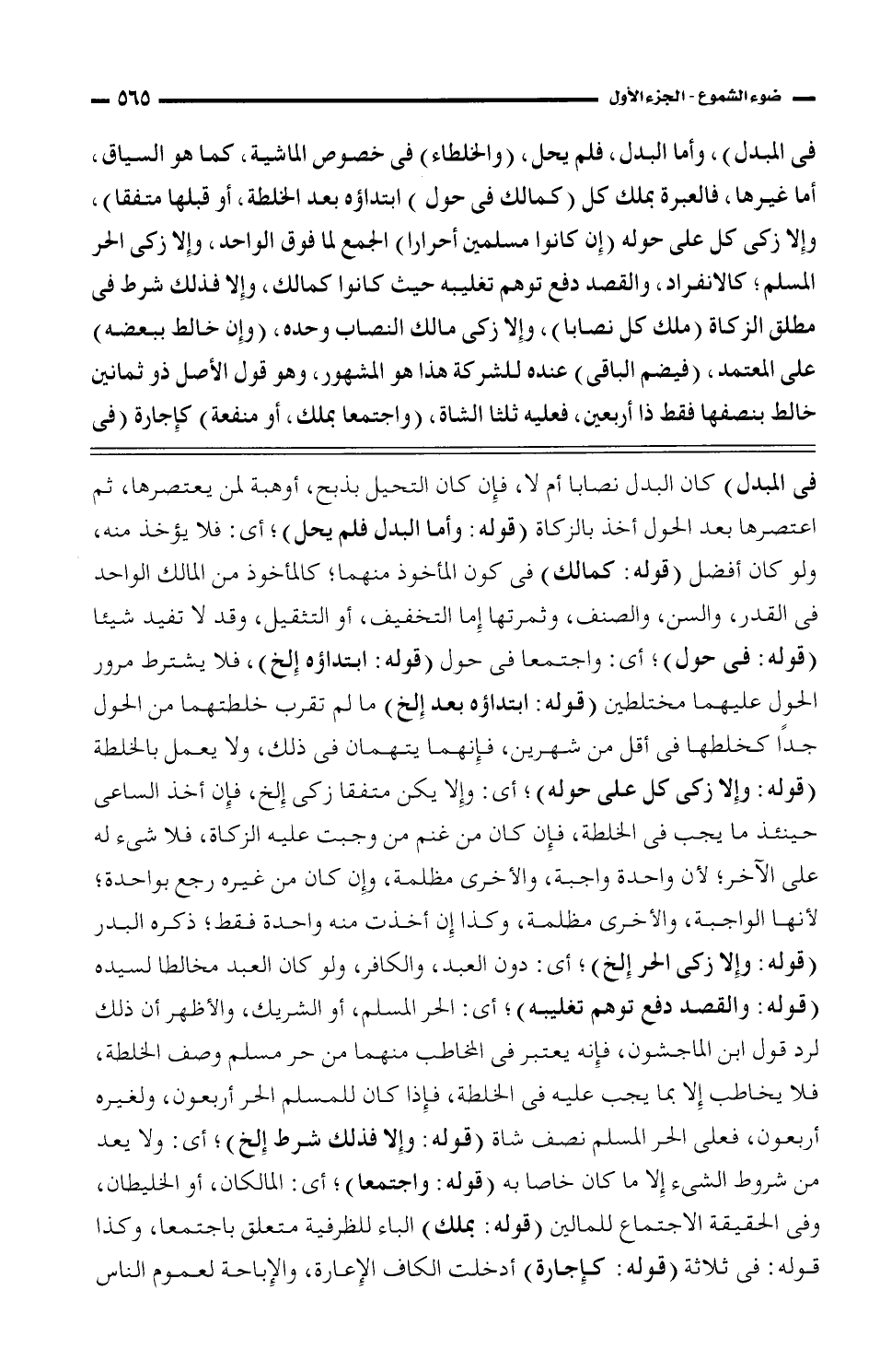 فى المبدل)، وأما البدل، فلم يحل، (والخلطاء) فى خصوص الماشية، كما هو السياق، أما غيرها، فالعبرة بملك كل (كمالك فى حول) ابتداؤه بعد الخلطة، أو قبلها متفقا)، وإلا زكى كل على حوله (إن كانوا مسلمين أحرارا) الجمع لما فوق الواحد، وإلا زكى الحر المسلم؛ كالانفراد، والقصد دفع توهم تغليبه حيث كانوا كمالك، وإلا فذلك شرط فى مطلق الزكاة (ملك كل نصابا)، وإلا زكى مالك النصاب وحده، (وإن خالط ببعضه) على المعتمد، (فيضم الباقي) عنده للشركة هذا هو المشهور، وهو قول الأصل ذو ثمانين خالط بنصفها فقط ذا أربعين، فعليه ثلثا الشاة، (واجتمعا بملك، أو منفعة) كإجارة (فى