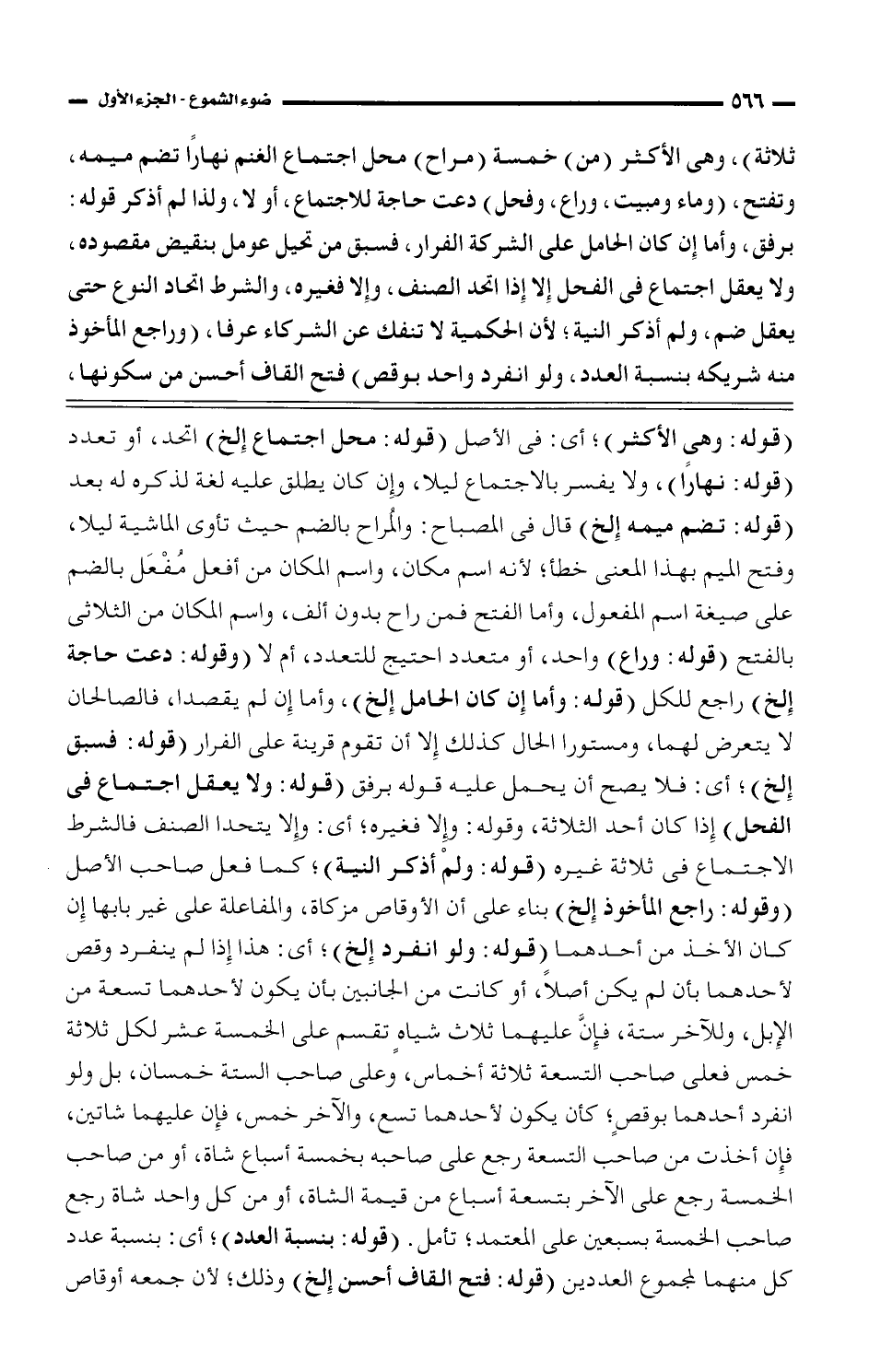 (قوله: وهى الأكثر)؛ أي: فى الأصل (قوله: محل اجتماع إلخ) اتحد، أو تعدد (قوله: نهارًا)، ولا يفسر بالاجتماع ليلا، وإن كان يطلق عليه لغة لذكره له بعد (قوله: تضم ميمه إلخ) قال فى المصباح: والمراح بالضم حيث تأوى الماشية ليلا، وفتح الميم بهذا المعنى خطأ؛ لأنه اسم مكان، واسم المكان من أفعل مفعل بالضم على صيغة اسم المفعول، وأما الفتح فمن راح بدون ألف، واسم المكان من الثلاثى بالفتح (قوله: وراع) واحد، أو متعدد احتيج للتعدد، أم لا (وقوله: دعت حاجة إلخ) راجع للكل (قوله: وأما إن كان الحامل إلخ)، وأما إن لم يقصدا، فالصالحان لا يتعرض لهما، ومستورا الحال كذلك إلا أن تقوم قرينة على الفرار (قوله: فسبق إلخ)؛ أي: فلا يصح أن يحمل عليه قوله برفق (قوله: ولا يعقل اجتماع فى الفحل) إذا كان أحد الثلاثة، وقوله: وإلا فغيره؛ أي: وإلا يتحدا الصنف فالشرط الاجتماع فى ثلاثة غيره (قوله: ولم أذكر النية)؛ كما فعل صاحب الأصل (وقوله: راجع المأخوذ إلخ) بناء على أن الأوقاص مزكاة، والمفاعلة على غير بابها إن كان الأخذ من أحدهما (قوله: ولو انفرد إلخ)؛ أي: هذا إذا لم ينفرد وقص لأحدهما بأن لم يكن أصلًا، أو كانت من الجانبين بأن يكون لأحدهما تسعة من الإبل، وللآخر ستة، فإنَّ عليهما ثلاث شياه تقسم على الخمسة عشر لكل ثلاثة خمس فعلى صاحب التسعة ثلاثة أخماس، وعلى صاحب الستة خمسان، بل ولو انفرد أحدهما بوقصٍ؛ كأن يكون لأحدهما تسع، والآخر خمس، فإن عليهما شاتين، فإن أخذت من صاحب التسعة رجع على صاحبه بخمسة أسباع شاة، أو من صاحب الخمسة رجع على الآخر بتسعة أسباع من قيمة الشاة، أو من كل واحد شاة رجع صاحب الخمسة بسبعين على المعتمد؛ تأمل. (قوله: بنسبة العدد)؛ أي: بنسبة عدد كل منهما لمجموع العددين (قوله: فتح القاف أحسن إلخ) وذلك؛ لأن جمعه أوقاص