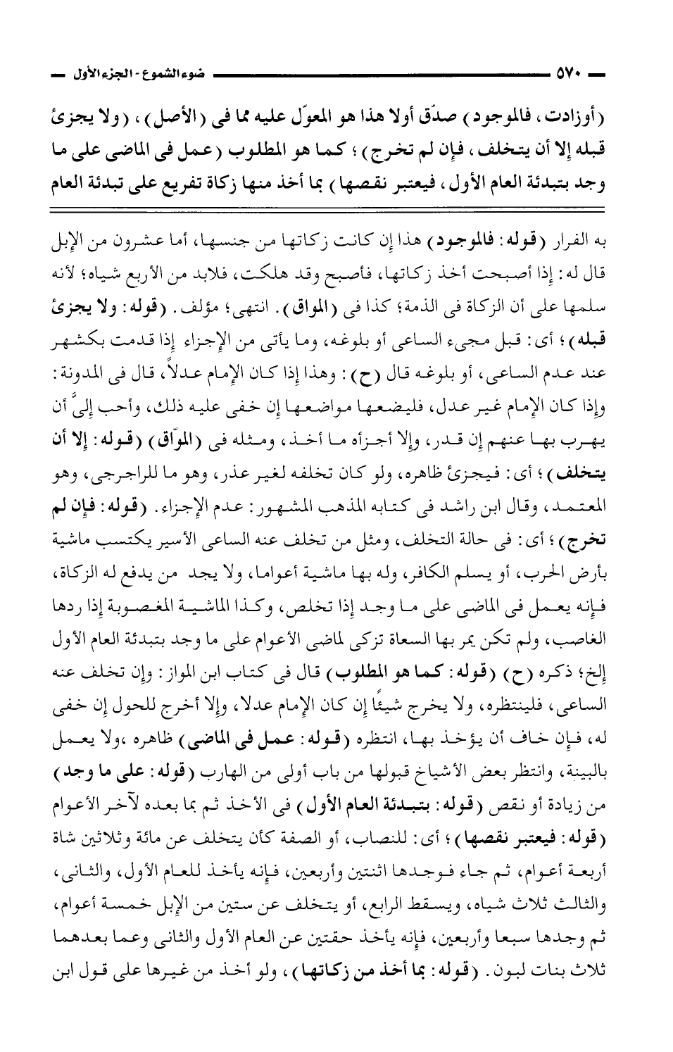 به الفرار (قوله: فالموجود) هذا إن كانت زكاتها من جنسها، أما عشرون من الإبل قال له: إذا أصبحت أخذ زكاتها، فأصبح وقد هلكت، فلابد من الأربع شياه؛ لأنه سلمها على أن الزكاة فى الذمة؛ كذا فى (المواق). انتهى؛ مؤلف. (قوله: ولا يجزئ قبله)؛ أي: قبل مجيء الساعى أو بلوغه، وما يأتى من الإجزاء إذا قدمت بكشهر عند عدم الساعي، أو بلوغه قال (ح): وهذا إذا كان الإمام عدلًا، قال فى المدونة: وإذا كان الإمام غير عدل، فليضعها مواضعها إن خفى عليه ذلك، وأحب إلىَّ أن يهرب بها عنهم إن قدر، وإلا أجزأه ما أخذ، ومثله فى (الموّاق (قوله: إلا أن يتخلف)؛ أي: فيجزئ ظاهره، ولو كان تخلفه لغير عذر. وهو ما للراجرجي، وهو المعتمد، وقال ابن راشد فى كتابه المذهب المشهور: عدم الإجزاء. (قوله: فإن لم تخرج)؛ أي: فى حالة التخلف، ومثل من تخلف عنه الساعى الأسير يكتسب ماشية بأرض الحرب، أو يسلم الكافر، وله بها ماشية أعواما، ولا يجد من يدفع له الزكاة، فإنه يعمل فى الماضى على ما وجد إذا تخلص، وكذا الماشية المغصوبة إذا ردها الغاصب، ولم تكن يمر بها السعاة تزكى لماضى الأعوام على ما وجد بتبدئة العام الأول إلخ؛ ذكره (ح) (قوله: ما هو المطلوب) قال فى كتاب ابن المواز: وإن تخلف عنه الساعي، فلينتظره، ولا يخرج شيئًا إن كان الإمام عدلًا، وإلا أخرج للحول إن خفى له، فإن خاف أن يؤخذ بها، انتظره (قوله: عمل فى الماضي) ظاهره، ولا يعمل بالبينة، وانتظر بعض الأشياخ قبولها من باب أولى من الهارب (قوله: على ما وجد) من زيادة أو نقص (قوله: بتبدئة العام الأول) فى الأخذ ثم بما بعده لآخر الأعوام (قوله: فيعتبر نقصها)؛ أي: للنصاب، أو الصفة كأن يتخلف عن مائة وثلاثين شاة أربعة أعوام، ثم جاء فوجدها اثنتين وأربعين، فإنه يأخذ للعام الأول، والثاني، والثالث ثلاث شياه، ويسقط الرابع، أو يتخلف عن ستين من الإبل خمسة أعوام، ثم وجدها سبعًا وأربعين، فإنه يأخذ حقتين عن العام الأول والثانى وعما بعدهما ثلاث بنات لبون. (قوله: بما أخذ من زكاتها)، ولو أخذ من غيرها على قول ابن