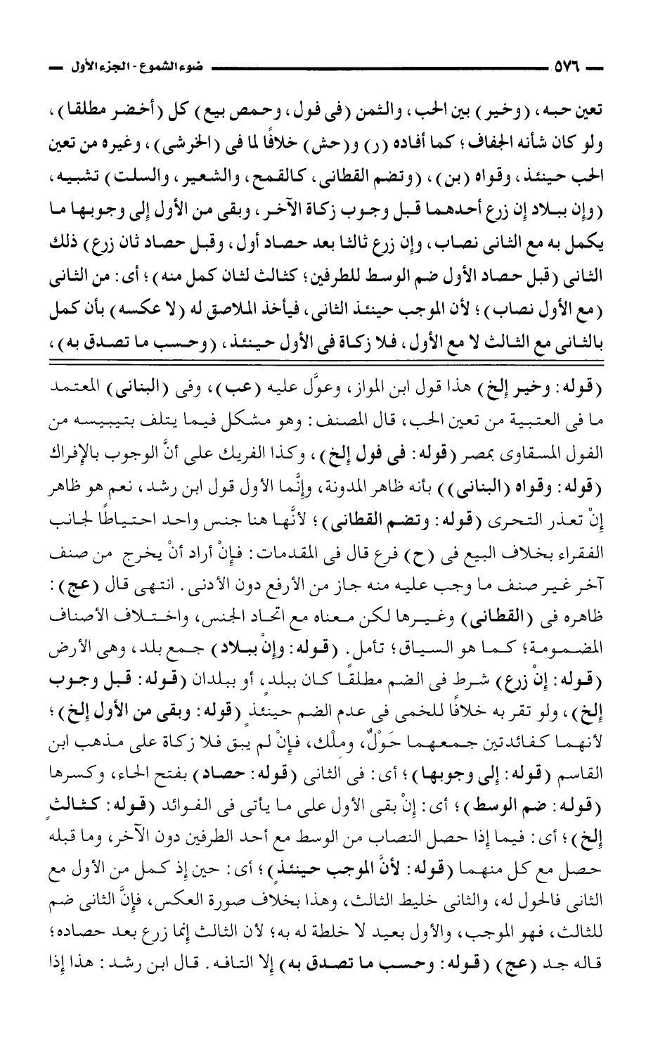 (قوله: وخير إلخ) هذا قول ابن المواز، وعوَّل عليه (عب)، وفى (البناني) المعتمد ما فى العتبية من تعين الحب، قال المصنف: وهو مشكل فيما يتلف بتيبيسه من الفول المسقاوى بمصر (قوله: فى فول إلخ)، وكذا الفريك على أنَّ الوجوب بالإفراك (قوله: وقواه (البناني)) بأنه ظاهر المدونة، وإنَّما الأول قول ابن رشد، نعم هو ظاهر إن تعذر التحرى (قوله: وتضم القطاني)؛ لأنَّها هنا جنس واحد احتياطًا لجانب الفقراء بخلاف البيع فى (ح) فرع قال فى المقدمات: فإن أراد أن يخرج من صنف آخر غير صنف ما وجب عليه منه جاز من الأرفع دون الأدنى. انتهى قال (عج): ظاهره فى (القطاني) وغيرها لكن معناه مع اتحاد الجنس، واختلاف الأصناف المضومة؛ كما هو الساق؛ تأمل. (قوله: وإن ببلاد) جمع بلد، وهى الأرض (قوله: إن زرع) شرط فى الضم مطلقًا كان ببلدٍ، أو ببلدان (قوله: قبل وجوب إلخ)، ولو تقر به خلافًا للخمى فى عدم الضم حينئذٍ (قوله: وبقى من الأول إلخ)؛ لأنهما كفائدتين جمعهما حولٌ، وملك، فإن لم يبق فلا زكاة على مذهب ابن القاسم (قوله: إلى وجوبها)؛ أي: فى الثانى (قوله: حصاد) بفتح الحاء، وكسرها (قوله: ضم الوسط)؛ أي: إن بقى الأول على ما يأتى فى الفوائد (قوله: كثالث إلخ)؛ أي: فيما إذا حصل النصاب من الوسط مع أحد الطرفين دون الآخر، وما قبله حصل مع كل منهما (قوله: لأنَّ الموجب حينئذ)؛ أي: حين إذ كمل من الأول مع الثانى فالحول له، والثانى خليط الثالث، وهذا بخلاف صورة العكس، فإنَّ الثانى ضم للثالث، فهو الموجب، والأول بعيد لا خلطة له به؛ لأن الثالث إنما زرع بعد حصاده؛ قاله جد (عج) (قوله: وحسب ما تصدق به) إلا التافه. قال ابن رشد: هذا إذا