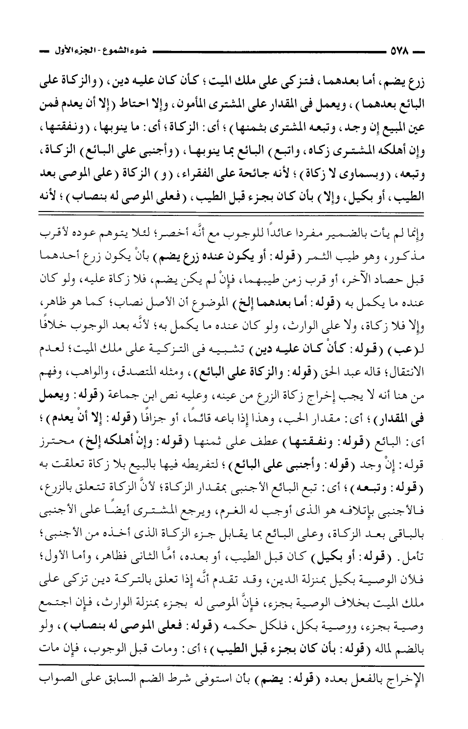 وإنما لم يأت بالضمير مفردا عائدًا للوجوب مع أنَّه أخصر؛ لئلا يتوهم عوده لأقرب مذكور، وهو طيب الثمر (قوله: أو يكون عنده زرع يضم) بأن يكون زرع أحدهما قبل حصاد الآخر، أو قرب زمن طيبهما، فإن لم يكن يضم، فلا زكاة عليه، ولو كان عنده ما يكمل به (قوله: أما بعدهما إلخ) الموضوع أن الأصل نصاب؛ كما هو ظاهر، وإلا فلا زكاة، ولا على الوارث، ولو كان عنده ما يكمل به؛ لأنَّه بعد الوجوب خلافًا لـ (عب) (قوله: كأن كان عليه دين) تشبيه فى التزكية على ملك الميت؛ لعدم الانتقال؛ قاله عبد الحق (قوله: والزكاة على البائع)، ومثله المتصدق، والواهب، وفهم من هنا أنه لا يجب إخراج زكاة الزرع من عينه، وعليه نص ابن جماعة (قوله: ويعمل فى المقدار)؛ أي: مقدار الحب، وهذا إذا باعه قائمًا، أو جزافًا (قوله: إلا أن يعدم)؛ أي: البائع (قوله: ونفقتها) عطف على ثمنها (قوله: وإن أهلكه إلخ) محترز قوله: إن وجد (قوله: وأجنبى على البائع)؛ لتفريطه فيها بالبيع بلا زكاة تعلقت به (قوله: وتبعه)؛ أي: تبع البائع الأجنبى بمقدار الزكاة؛ لأنَّ الزكاة تتعلق بالزرع، فالأجنبى بإتلافه هو الذى أوجب له الغرم، ويرجع المشترى أيضًا على الأجنبى بالباقى بعد الزكاة، وعلى البائع بما يقابل جزء الزكاة الذى أخذه من الأجنبي؛ تأمل. (قوله: أو بكيل) كان قبل الطيب، أو بعده، أمَّا الثانى فظاهر، وأما الأول؛ فلأن الوصية بكيل بمنزلة الدين، وقد تقدم أنَّه إذا تعلق بالتركة دين تزكى على ملك الميت بخلاف الوصية بجزء، فإنَّ الموصى له بجزء بمنزلة الوارث، فإن اجتمع وصية بجزء، ووصية بكل، فلكل حكمه (قوله: فعلى الموصى له بنصاب)، ولو بالضم لماله (قوله: بأن كان بجزء قبل الطيب)؛ أي: ومات قبل الوجوب، فإن مات