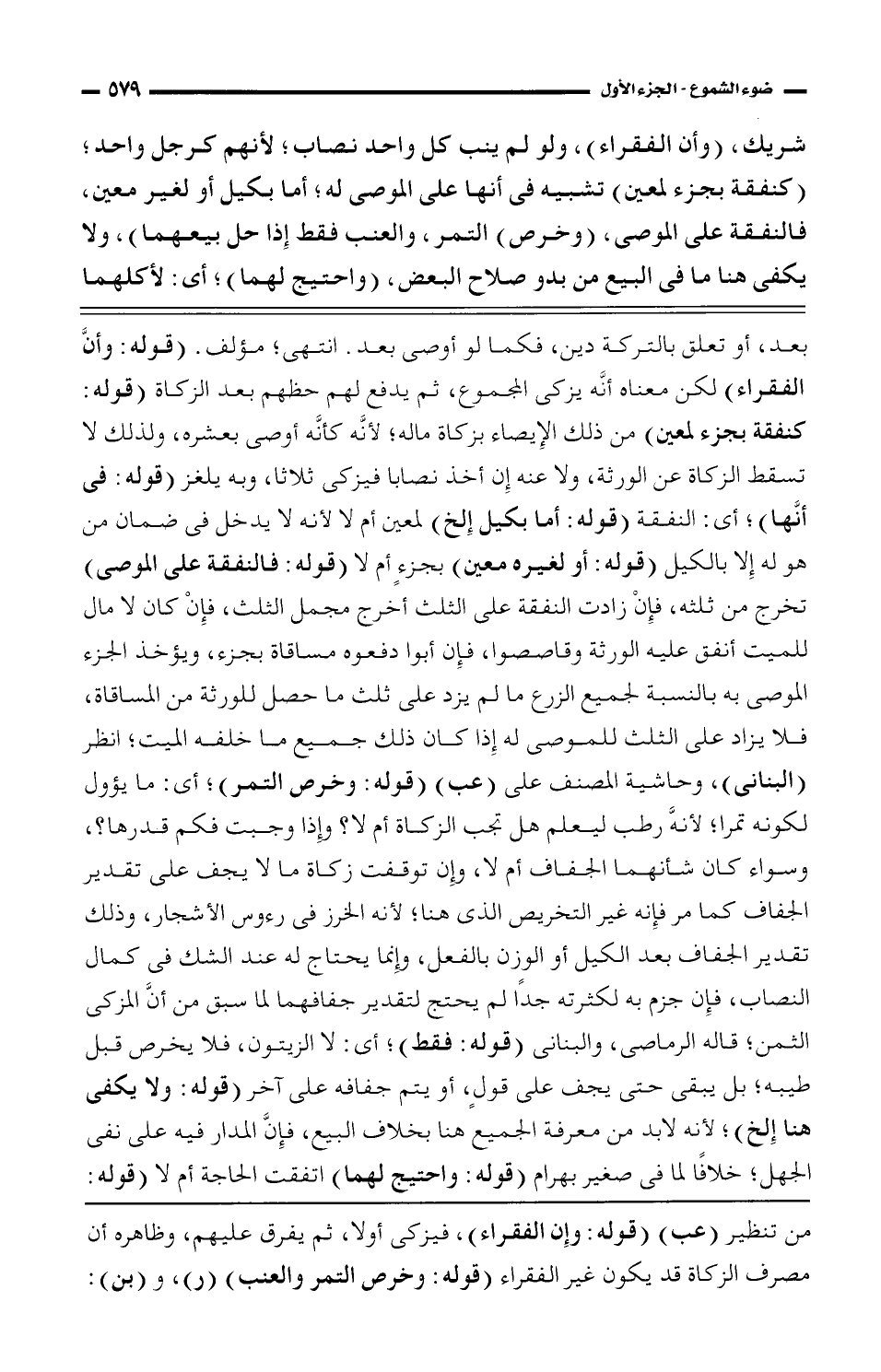 شريك، (وأن الفقراء)، ولو لم ينب كل واحد نصاب؛ لأنهم كرجل واحد؛ (كنفقة بجزء لمعين) تشبيه فى أنها على الموصى له؛ أما بكيل أو لغير معين، فالنفقة على الموصي، (وخرص) التمر، والعنب فقط إذا حل بيعهما)، ولا يكفى هنا ما فى البيع من بدو صلاح البعض، (واحتيج لهما)؛ أي: لأكلهما