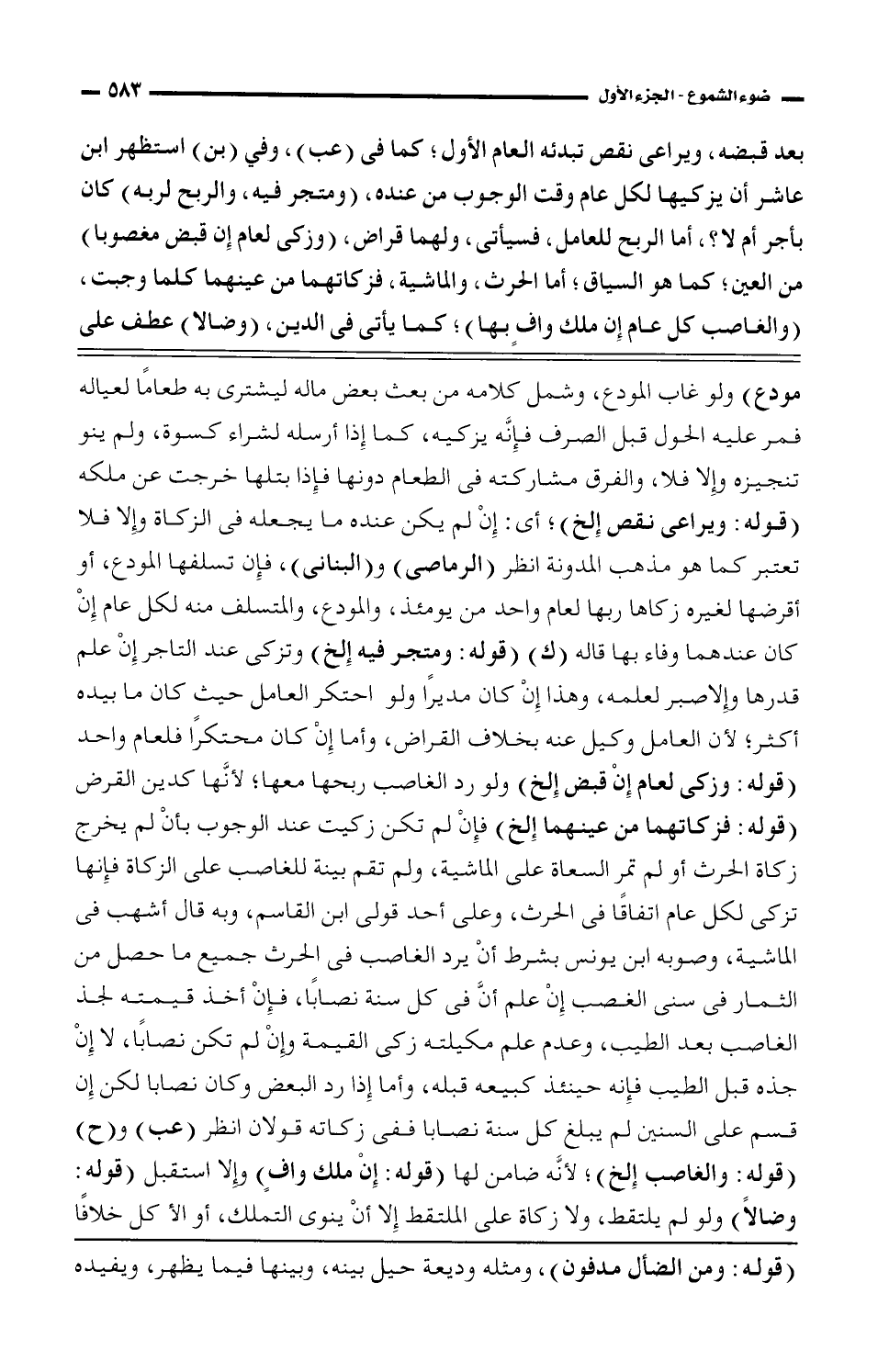 بعد قبضه، ويراعى نقص تبدئه العام الأول؛ كما فى (عب)، وفى (بن) استظهر ابن عاشر أن يزكيها لكل عام وقت الوجوب من عنده، (ومتجر فيه، والربح لربه) كان بأجر أم لا؟ ، أما الربح للعامل، فسيأتي، ولهما قراض، (وزكى لعام إن قبض مغصوبا) من العين؛ كما هو السياق؛ أما الحرث، والماشية، فزكاتهما من عينهما كلما وجبت، (والغاصب كل عام إن ملك وافٍ بها)، كما يأتى فى الدين، (وضالا) عطف على