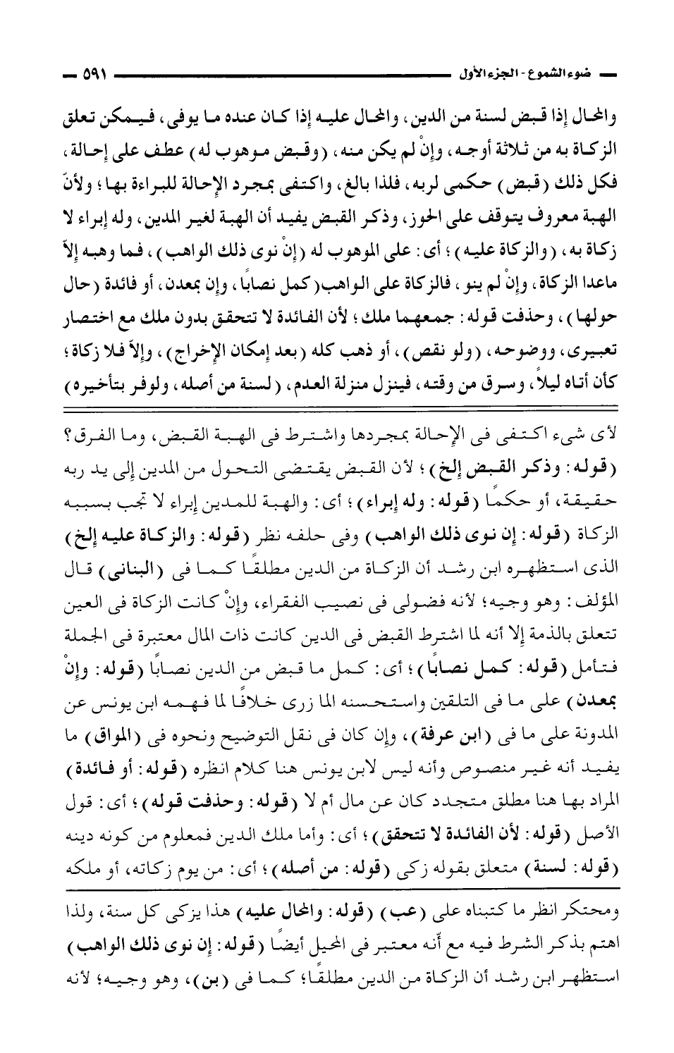 والمحال إذا قبض لسنة من الدين، والمحال عليه إذا كان عنده ما يوفى، فيمكن تعلق الزكاة به من ثلاثة أوجه، وإن لم يكن منه، (وقبض موهوب له) عطف على إحالة، فكل ذلك (قبض) حكمى لربه، فلذا بالغ، واكتفى بمجرد الإحالة للبراءة بها؛ ولأنّ الهبة معروف يتوقف على الحوز، وذكر القبض يفيد أن الهبة لغير المدين، وله إبراء لا زكاة به، (والزكاة عليه)؛ أي: على الموهوب له (إن نوى ذلك الواهب)؛ فما وهبه إلاّ ما عدا الزكاة، وإن لم ينو، فالزكاة على الواهب (كمل نصابًا، وإن بمعدن، أو فائدة (حال حولها)، وحذفت قوله: جمعهما ملك؛ لأن الفائدة لا تتحقق بدون ملك مع اختصار تعبيري، ووضوحه، (ولو نقص)، أو ذهب كله (بعد إمكان الإخراج)، وإلا فلا زكاة؛ كأن أتاه ليلًا، وسرق من وقته، فينزل منزلة العدم، (لسنة من أصله، ولو فر بتأخيره)