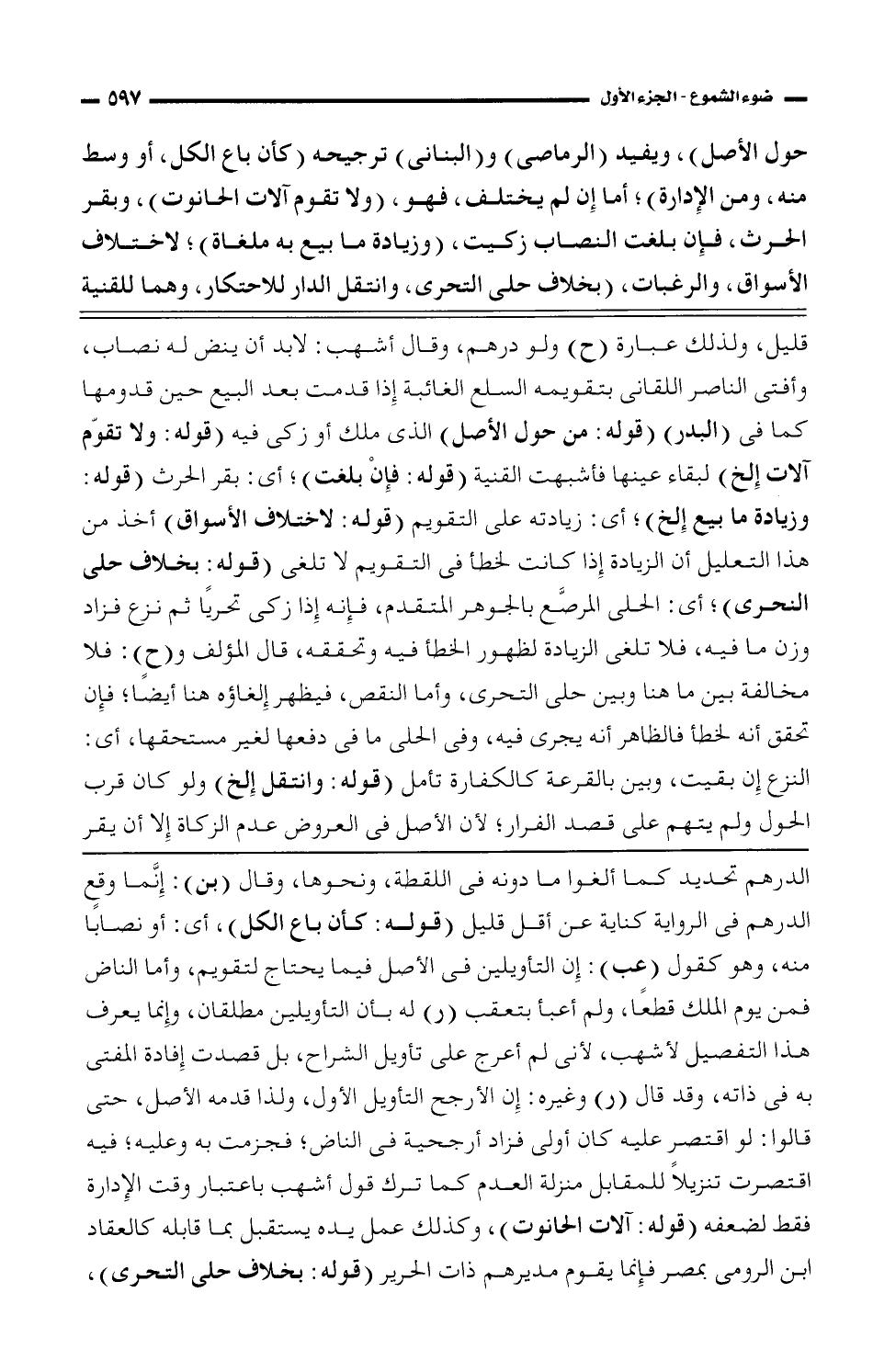 الدرهم تحديد كما ألغوا ما دونه فى اللقطة، ونحوها، وقال (بن): إنَّما وقع الدرهم فى الرواية كناية عن أقل قليل (قوله: كأن باع الكل)، أي: أو نصابًا منه، وهو كقول (عب): إن التأويلين فى الأصل فيما يحتاج لتقويم، وأما الناض فمن يوم الملك قطعًا، ولم أعبأ بتعقب (ر) له بأن التأويلين مطلقان، وإنما يعرف هذا التفصيل لأشهب، لأنى لم أعرج على تأويل الشراح، بل قصدت إفادة المفتى به فى ذاته، وقد قال (ر) وغيره: إن الأرجح التأويل الأول، ولذا قدمه الأصل، حتى قالوا: لو اقتصر عليه كان أولى فزاد أرجحية فى الناض؛ فجزمت به وعليه؛ فيه اقتصرت تنزيلًا للمقابل منزلة العدم كما ترك قول أشهب باعتبار وقت الإدارة فقط لضعفه (قوله: آلات الحانوت)، وكذلك عمل يده يستقبل بما قابله كالعقاد ابن الرومى بمصر فإنما يقوم مديرهم ذات الحرير (قوله: بخلاف حلى التحري)،