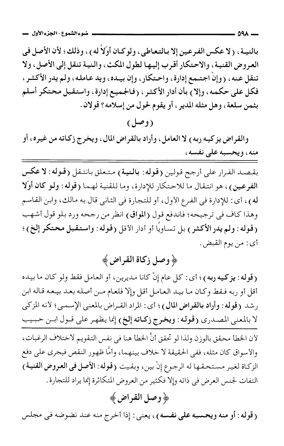 (قوله: يزكيه ربه)؛ أي: كل عام إن كانا مديرين، أو العامل فقط ولو كان ما بيده أقل أو ربه فقط وكان ما بيد العامل أقل وإلا فلعام من أصله بعد بيعه قاله ابن رشد (قوله: وأراد بالقرض المال)؛ أي: المراد القراض بالمعنى الإسمي؛ لأنه المزكى لا بالمعنى المصدرى (قوله: ويخرج زكاته إلخ) إنما يظهر على قول ابن حبيب