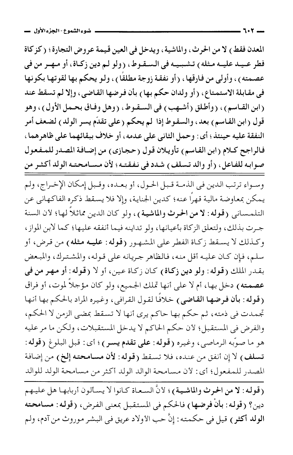 وسواء ترتب الدين فى الذمة قبل الحول، أو بعده، وقبل إمكان الإخراج، ولم يمكن بمعاوضة مالية قهرًا عنه؛ كدين الجناية، وإلا فلا يسقط ذكره الفاكهانى عن التلمسانى (قوله: لا من الحرث والماشية)، ولو كان الدين مماثلًا لها؛ لأن السنة جرت بذلك، ولتعلق الزكاة بأعيانها، ولو تداينه فيما أنفقه عليها؛ كما لابن المواز، وكذلك لا يسقط زكاة الفطر على المشهور (قوله: عليه مثله) من قرض، أو سلم، فإن كان عليه أقل منه، فالظاهر جريانه على قوله، والمشترك، والمبعض بقدر الملك (قوله: ولو دين زكاة) كان زكاة عين، أو لا (قوله: أو مهر من فى عصمته) دخل بها أم لا على أنها تملك الجميع، ولو كان مؤجلًا لموت، أو فراق (قوله: بأن فرضها القاضي) خلافًا لقول القرافي، وغيره المراد بالحكم بها أنها تجمدت فى ذمته، ثم حكم بها حاكم يرى أنها لا تسقط بمضى الزمن لا الحكم، والفرض فى المستقبل؛ لأن حكم الحاكم لا يدخل المستقبلات، ولكن ما مر عليه هو ما صوّبه الرماصي، وغيره (قوله: على تقدم يسر)؛ أي: قبل البلوغ (قوله: تسلف) لا إن أنفق من عنده، فلا تسقط (قوله: لأن مسامحته إلخ) من إضافة المصدر للمفعول؛ أي: لأن مسامحة الوالد الولد أكثر من مسامحة الولد للوالد