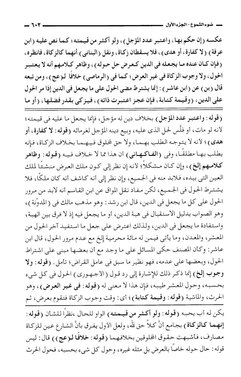 (قوله: واعتبر عدد المؤجل) بخلاف دين له مؤجل، فإنما يجعل ما عليه فى قيمته؛ لأنه لو مات، أو فلَّس لحل الذى عليه، وبيع دينه المؤجل لغرمائه (قوله: لا كفارة، أو هدى)؛ لأنه لا يتوجه الطلب بهما، ولاحق لمخلوق فيهما بخلاف الزكاة، فإنه يطلب بها مطلقًا، وفى (الفاكهاني) أن هذا مما لا خلاف فيه (قوله: وظاهر كلامهم إلخ)، وإن كان مشكلًا؛ لأنه إن نظر إلى كون ملك العرض منشئًا لملك العين التى بيده، فلابد منه فى الجميع، وإن نظر إلى أنه كاشف أنه كان ملكًا، فلا يشترط الحول فى الجميع، لكن مفاد نقل المواق عن ابن القاسم أنه لابد من مرور الحول على كل ما يجعل فى الدين، قال ابن رشد: وهو مذهب مالك فى (المدوّنة)، وهو الصواب بدليل الاستقبال فى هبة الدين، أو ما يجعل فيه إذ لا فرق بين الهبة، واستفادة ما يجعل فى الدين، ولذلك اعترض على جعل ما استفيد آخر الحول من المعشر، والمعدن، وما يأتى فيمن له مائة محرمية إلخ مع عدم مرور الحول، قال ابن عاشر: وكأن المصنف حكى المسائل على ما وجد مع أن بعضها مبنى على اشتراط الحول، وبعضها على عدمه، فهو نظير ما سبق فى عامل القراض؛ تأمل. (قوله: ولا وجوب إلخ) إنما ذكر ذلك للإشارة إلى رد قول (الأجهوري) الحول فى كل شيء بحسبه، وحول المعشر طيبه، فإن هذا لا معنى له (قوله: فى غير العرض)، وهو الحرث، والماشية (قوله: وقيمة كتابة)، أي: وقت وجوب الزكاة فتقوم بعرض، ثم