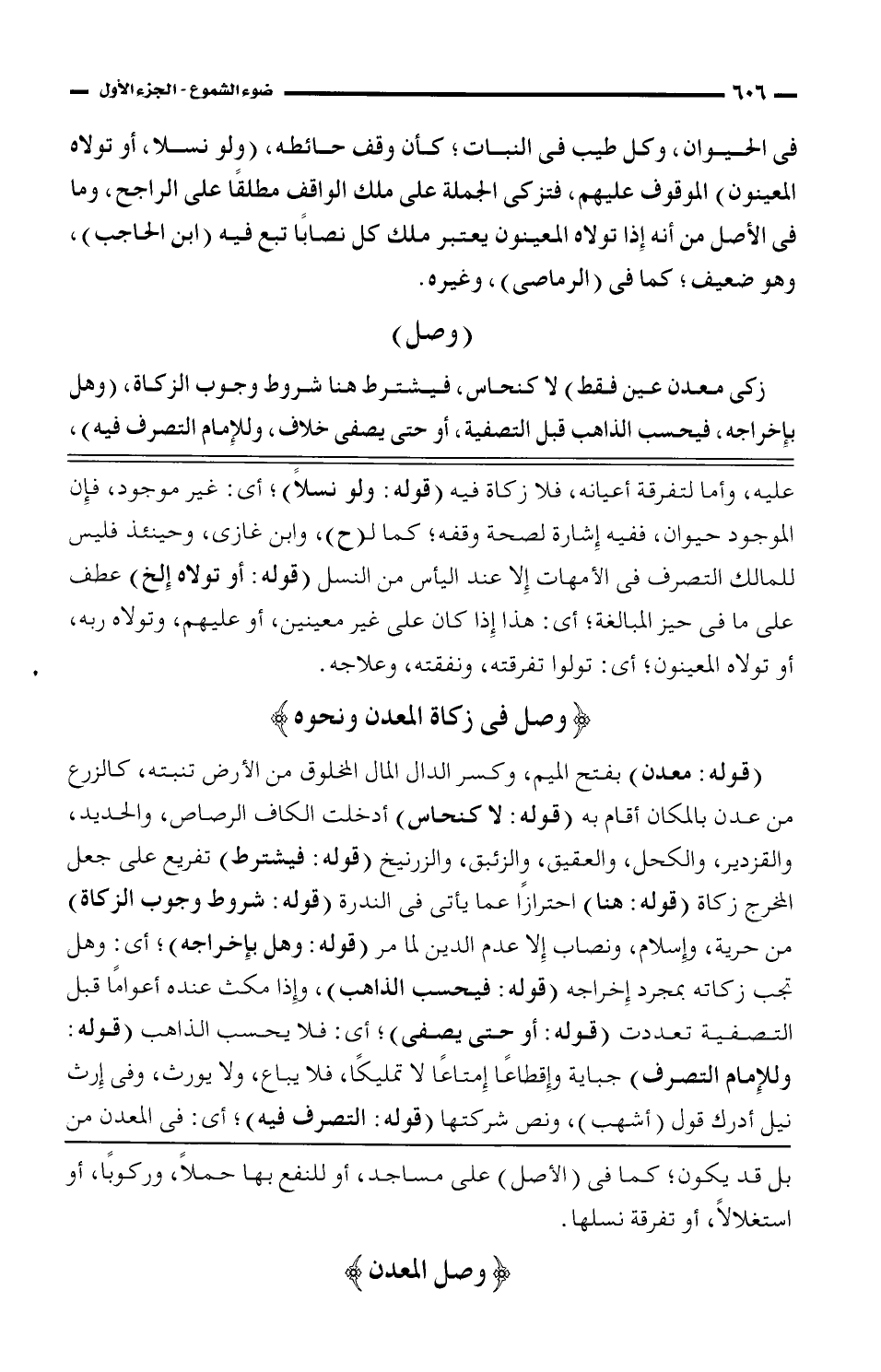 (قوله: معدن) بفتح الميم، وكسر الدال المال المخلوق من الأرض تنبته، كالزرع من عدن بالمكان أقام به (قوله: لا كنحاس) أدخلت الكاف الرصاص، والحديد، والقزدير، والكحل، والعقيق، والزئبق، والزرنيخ (قوله: فيشترط) تفريع على جعل المخرج زكاة (قوله: هنا) احترازًا عما يأتى فى الندرة (قوله: شروط وجوب الزكاة) من حرية، وإسلام، ونصاب إلا عدم الدين لما مر (قوله: وهل بإخراجه)؛ أي: وهل تجب زكاته بمجرد إخراجه (قوله: فيحسب الذاهب)، وإذا مكث عنده أعوامًا قبل التصفية تعددت (قوله: أو حتى يصفى)؛ أي: فلا يحسب الذاهب (قوله: وللإمام التصرف) جباية وإقطاعًا إمتاعًا لا تمليكًا، فلا يباع، ولا يورث، وفى إرث نيل أدرك قول (أشهب)، ونص شركتها (قوله: التصرف فيه)؛ أي: فى المعدن من