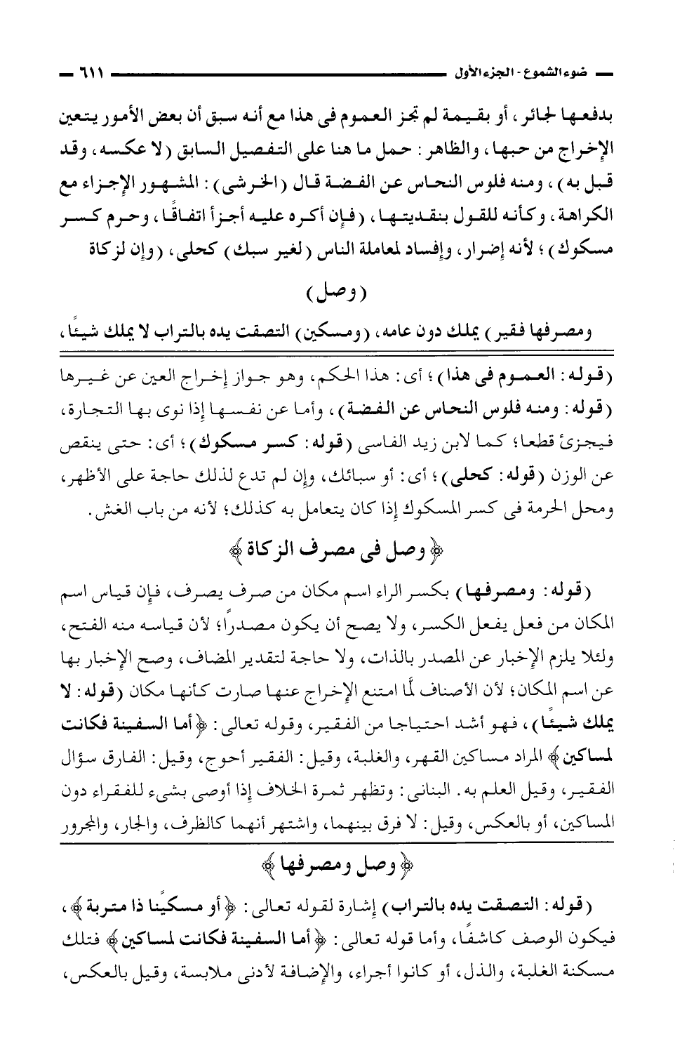 (قوله: ومصرفها) بكسر الراء اسم مكان من صرف يصرف، فإن قياس اسم المكان من فعل يفعل الكسر، ولا يصح أن يكون مصدرًا؛ لأن قياسه منه الفتح، ولئلا يلزم الإخبار عن المصدر بالذات، ولا حاجة لتقدير المضاف، وصح الإخبار بها عن اسم المكان؛ لأن الأصناف لمَّا امتنع الإخراج عنها صارت كأنها مكان (قوله: لا يملك شيئًا)، فهو أشد احتياجًا من الفقير، وقوله تعالى: {أما السفينة فكانت لمساكين} المراد مساكين القهر، والغلبة، وقيل: الفقير أحوج، وقيل: الفارق سؤال الفقير، وقيل العلم به. البناني: وتظهر ثمرة الخلاف إذا أوصى بشيء للفقراء دون المساكين، أو بالعكس، وقيل: لا فرق بينهما، واشتهر أنهما كالظرف، والجار، والمجرور