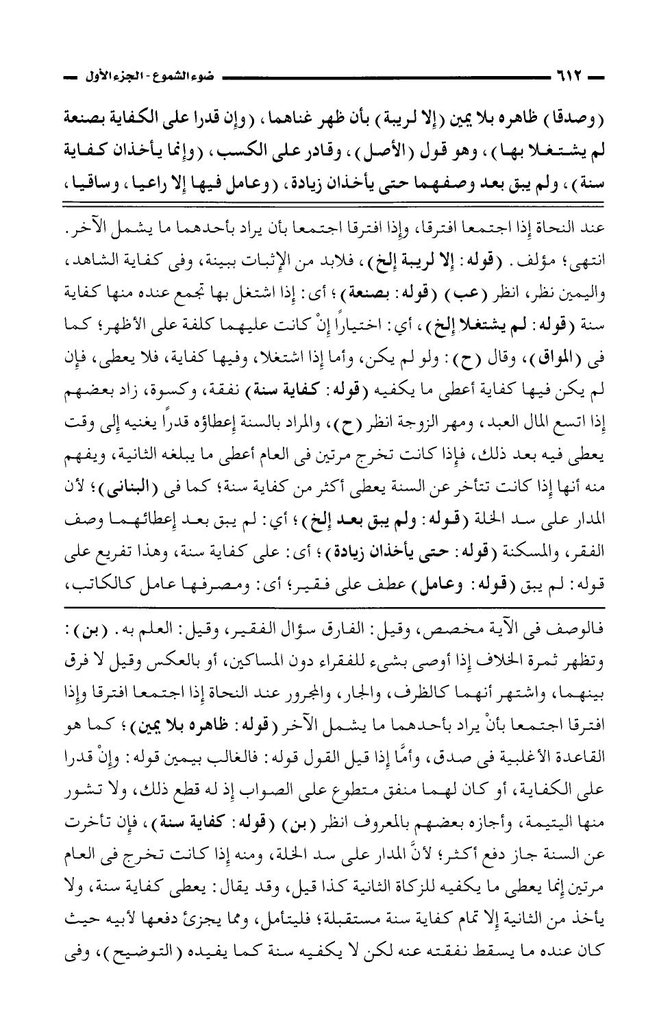 فالوصف فى الآية مخصص، وقيل: الفارق سؤال الفقير، وقيل: العلم به. (بن): وتظهر ثمرة الخلاف إذا أوصى بشيء للفقراء دون المساكين، أو بالعكس وقيل لا فرق بينهما، واشتهر أنهما كالظرف، والجار، والمجرور عند النحاة إذا اجتمعا افترقا وإذا افترقا اجتمعا بأن يراد بأحدهما ما يشمل الآخر (قوله: ظاهره بلا يمين)؛ كما هو القاعدة الأغلبية فى صدق، وأمَّا إذا قيل القول قول: فالغالب بيمين قوله: وإن قدرا على الكفاية، أو كان لهما منفق متطوع على الصواب إذ له قطع ذلك، ولا تشور منها اليتيمة، وأجازه بعضهم بالمعروف انظر (بن) (قوله: كفاية سنة)، فإن تأخرت عن السنة جاز دفع أكثر؛ لأنَّ المدار على سد الخلة، ومنه إذا كانت تخرج فى العام مرتين إنما يعطى ما يكفيه للزكاة الثانية كذا قيل، وقد يقال: يعطى كفاية سنة، ولا يأخذ من الثانية إلا تمام كفاية سنة مستقبلة؛ فليتأمل، ومما يجزئ دفعها لأبيه حيث كان عنده ما يسقط نفقته عنه لكن لا يكفيه سنة كما يفيده (التوضيح)، وفى