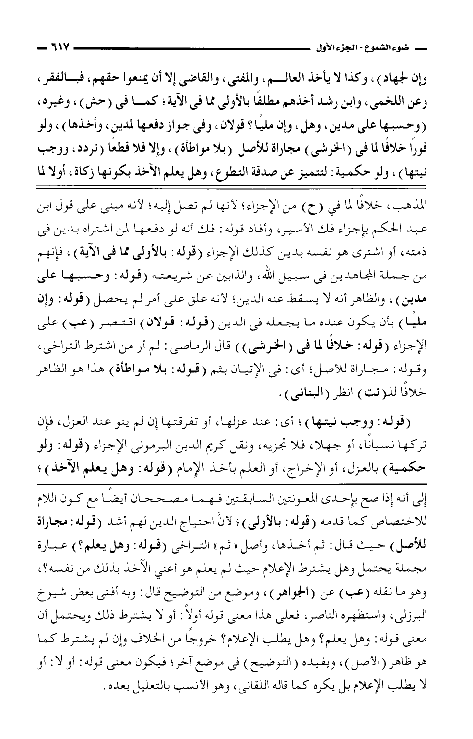 إلى أنه إذا صح بإحدى المعونتين السابقتين فهما مصححان أيضًا مع كون اللام للاختصاص كما قدمه (قوله: بالأولى)؛ لأنَّ احتياج الدين لهم أشد (قوله: مجاراة للأصل) حيث قال: ثم أخذها، وأصل ((ثم)) التراخى (قوله: وهل يعلم؟ ) عبارة مجملة يحتمل وهل يشترط الإعلام حيث لم يعلم هو أعنى الآخذ بذلك من نفسه؟ ، وهو ما نقله (عب) عن (الجواهر)، وموضع من التوضيح قال: وبه أفتى بعض شيوخ البرزلى، واستظهره الناصر، فعلى هذا معنى قوله أولًا: أو لا يشترط ذلك ويحتمل أن معنى قوله: وهل يعلم؟ وهل يطلب الإعلام؟ خروجًا من الخلاف وإن لم يشترط كما هو ظاهر (الأصل)، ويفيده (التوضيح) فى موضع آخر؛ فيكون معنى قوله: أو لا: أو لا يطلب الإعلام بل يكره كما قاله اللقانى، وهو الأنسب بالتعليل بعده.