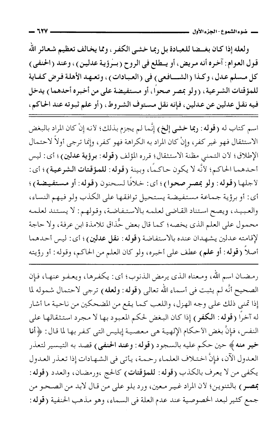 ولعله إذا كان بغضًا للعبادة بل ربما خشى الكفر، ومما يخالف تعظيم شعائر الله قول العوام: آخره أنه مريض، أو يطلع فى الروح (برؤية عدلين)، وعند (الحنفى) كل مسلم عدل، وكذا (الشافعى) فى (العبادات)، وتعهد الأهلة فرض كفاية للمؤقتات الشرعية، (ولو بمصر صحوًا، أو مستفيضة على من أخبره بأحدهما) يدخل فيه نقل عدلين عن عدلين، فإنه نقل مستوف الشروط، (أو علم ثبوته عند الحاكم،