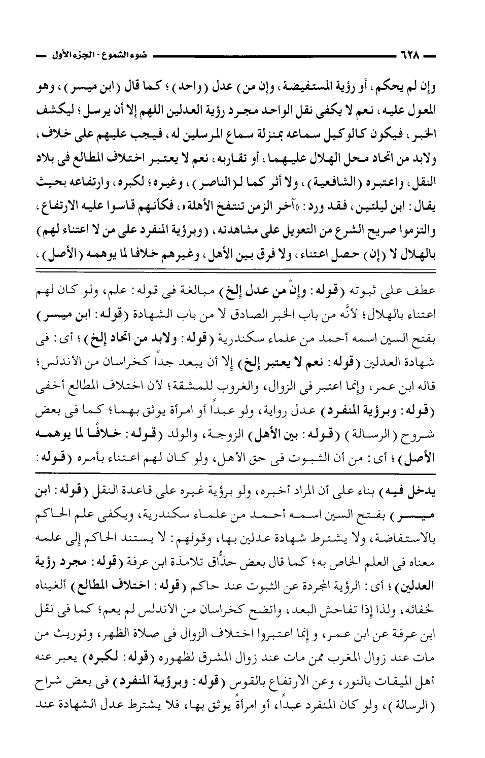 وإن لم يحكم، أو رؤية المستفيضة، وإن من) (واحد)؛ كما قال (ابن ميسر)، وهو المعول عليه، نعم لا يكفى نقل الواحد مجرد رؤية العدلين اللهم إلا أن يرسل؛ ليكشف الخبر، فيكون كالوكيل سماع بمنزلة سماع المرسلين له، فيجب عليهم على خلاف، ولابد من اتحاد محل الهلال عليهما، أو تقاربه، نعم لا يعتبر اختلاف المطالع فى بلاد النقل، واعتبره (الشافعية)، ولا أثر كما لـ (الناصر)، وغيره؛ لكبره، وارتفاعه بحيث يقال: ابن ليلتين، فقد ورد: ((آخر الزمن تنتفخ الأهلة، فكأنهم قاسوا عليه الارتفاع، والتزموا صريح الشرع من التعويل على مشاهدته، (وبرؤية المنفرد على من لا اعتناء لهم) بالهلال لا (إن) حصل اعتناء، ولا فرق بين الأهل، وغيرهم خلافًا لما يوهمه (الأصل)،