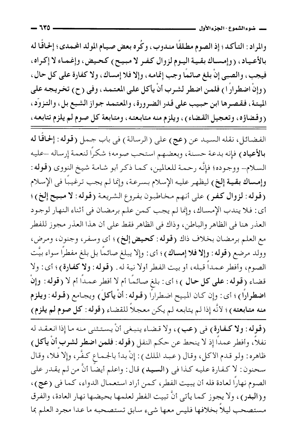 الفضائل، نقله السيد عن (عج) على (الرسالة) فى باب جمل (قوله: إلحاقًا له بالأعياد) فإنه بدعة حسنة، وبعضهم استحب صومه؛ شكرًا لنعمه إرساله- عليه السلام- ووجوده؛ فإنَّه رحمة للعالمين، كما ذكر أبو شامة شيخ النووي (قوله: وإمساك بقية إلخ) ليظهر عليه السلام بسرعة، وإنما لم يجب ترغيبًا في الإسلام (قوله: لزوال كفر) على أنهم مخاطبون بفروع الشريعة (قوله: لا مبيح إلخ)؛ أى: فلا يندب الإمساك، وإنما لم يجب كمن علم برمضان في أثناء النهار لوجود العذر هنا في الظاهر والباطن، وذاك في الظاهر فقط على أن هذا العذر مجوز للفطر مع العلم برمضان بخلاف ذاك (قوله: كحيض إلخ)؛ أى وسفر، وجنون، ومرض، وولد مرضع (قوله: وإلا فلا إمساك)؛ أى: وإلا يبلغ صائمًا بل بلغ مفطرًا سواء بيَّت الصوم، ، وأفطر عمدًا قبله، أو بيت الفطر أو لا نية له. (قوله: ولا كفارة)؛ أى: ولا قضاء (قوله: على كل حال)؛ أى: بلغ صائمًا أم لا أفطر عمدًا أم لا (قوله: وإن اضطرارًا)؛ أى: وإن كان المبيح اضطرارًا (قوله: أن يأكل) ويجامع (قوله: ويلزم منه متابعته)؛ لأنَّه إذا لم يتابعه لم يكن معجلًا للقضاء (قوله: كل صوم لم يلزم)