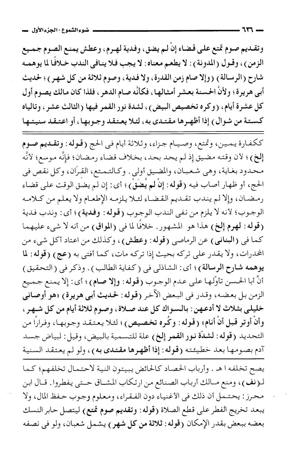 ككفارة يمين، وتمتع، وصيام جزاء، وثلاثة أيام فى الحج (قوله: وتقديم صوم إلخ)؛ لأن وقته مضيق إذ لم يحد بحد، بخلاف قضاء رمضان؛ فإنَّه موسع؛ لأنَّه محدود بغاية، وهى شعبان، والمضيق أولى. وكالتمتع، القرآن، وكل نقص فى الحج، أو ظهار أصاب فيه (قوله: إن لم يضق)؛ أي: إن لم يضق الوقت على قضاء رمضان، وإلا لم يندب تقديم القضاء لئلا يلزمه الإطعام ولا يعلم من كلامه الوجوب؛ لأنه لا يلزم من نفى الندب الوجوب (قوله: وفدية)؛ أى: وندب فدية (قوله: لهرم إلخ) هذا هو المشهور. خلافًا لما في (المواق) من انه لا شئ عليهما كما في (البنانى) عن الرماصى (قوله: وعطش)، وكذلك من اعتاد أكل شئ من المخدرات، ولا يقدر على تركه بحيث إذا تركه مات، كما أفتى به (عج) (قوله: لما يوهمه شارح الرسالة)؛ أى: الشاذلى فى (كفاية الطالب). وذكر فى (التحقيق) أنَّ أبا الحسن تأوّلها على عدم الوجوب (قوله: وإلا صام)؛ أى: إلا يمنع جميع الزمن بل بعضه، وقدر فى البعض الآخر (قوله: لحديث أبى هريرة) ((هو أوصانى خليلى بثلاث لا أدعهن: بالسواك كل عند صلاة، وصوم ثلاثة أيام من كل شهر، وأن أوتر قبل أن أنام)) (قوله: وكره تخصيص)؛ لئلا يعتقد وجوبها، وفرارًا من التحديد (قوله: لشدة نور القمر إلخ) علة للتسمية بالبيض، وقيل: لبياض جسد آدم بصومها بعد خطيئته (قوله: إذا أظهرها مقتدى به)، ولو لم يعتقد السنية