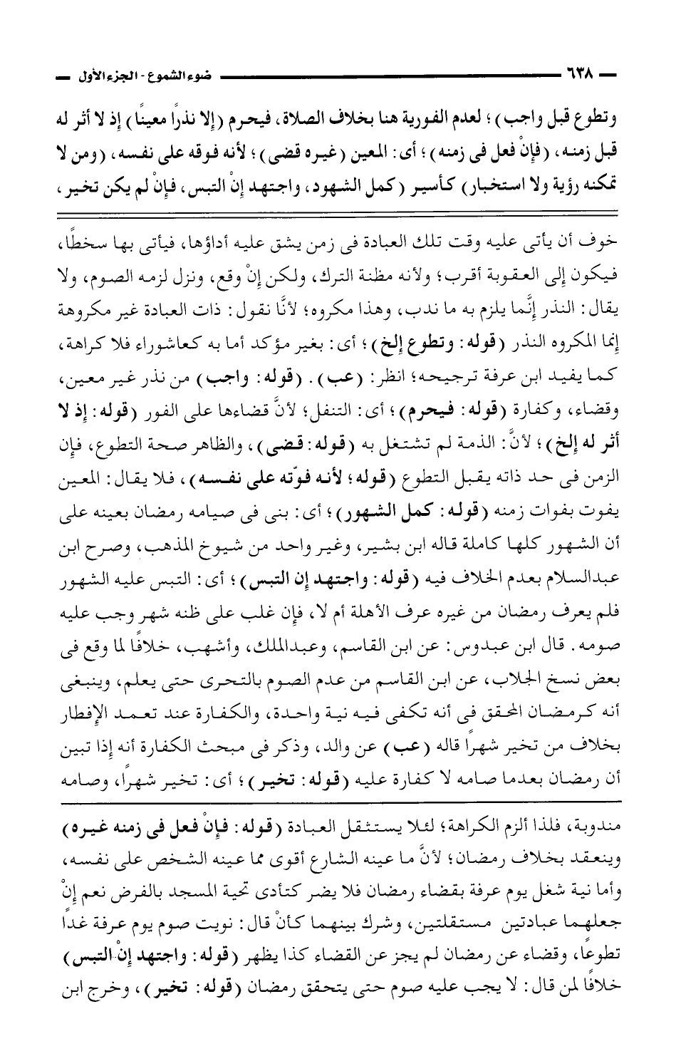متكرر خوف أن يأتى عليه وقت تلك العبادة فى زمنه يشق عليه أداؤها، فيأتى بها سخطًا، فيكون إلى العقوبة أقرب؛ ولأنه مظنة الترك، ولكن إن وقع، ونزا لزمه الصوم، ولا يقال: النذر إنَّما يلزم به ما ندب، وهذا مكروه؛ لأنَّا نقول: ذات العبادة غير مكروهة إنما المكروه النذر (قوله: وتطوع إلخ)؛ أى: بغير مؤكد أما به كعاشوراء فلا كراهة، كما يفيد ابن عرفة ترجيحه؛ انظر: (عب). (قوله: واجب) من نذر غير معين، وقضاء، وكفارة (قوله: فيحرم)؛ أى: التنفل؛ لأنَّ قضاءها على الفور (قوله: إذ لا أثر له إلخ)؛ لأنَّ: الذمة لم تشتغل به (قوله: قضى)، والظاهر صحة التطوع، فإن الزمن فى حد ذاته يقبل التطوع (قوله: لأنه فوته على نفسه)، فلا يقال: المعين يفوت بفوات زمنه (قوله: كمل الشهور)؛ أى: بنى فى صيامه رمضان بعينه على أن الشهور كلها كاملة قاله ابن بشير، وغير واحد من شيوخ المذهب، وصرح ابن عبد السلام بعدم الخلاف فيه (قوله: واجتهد إن التبس)؛ أى: التبس عليه الشهور فلم يعرف رمضان من غيره عرف الأهلة أم لا، فإن غلب على ظنه شهر وجب عليه صومه. قال ابن عبدوس: عن ابن القاسم، وعبد الملك، وأشهب، خلافًا لما وقع فى بعض نسخ الجلاب، عن ابن القاسم من عدم الصوم بالتحرى حتى يعلم، وينبغى أنه كرمضان المحقق فى أنه تكفى فيه نية واحدة، والكفارة عند تعمد الإفطار بخلاف من تخير شهرًا قاله (عب) عن والد، وذكر فى مبحث الكفارة أنه إذا تبين أن رمضان بعدما صامه لا كفارة عليه (قوله: تخير)؛ أى: تخير شهرًا، وصامه