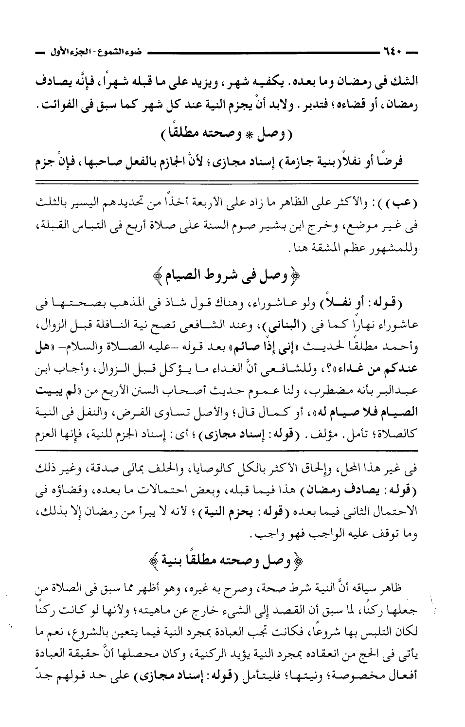 ظاهر ساقيه أنَّ النية شرط صحة، وصرح به غيره، وهو أظهر مما سبق فى الصلاة من جعلها ركنًا، لما سبق أن القصد إلى الشئ خارج عن ماهيته؛ ولأنها لو كانت ركنًا لكان التبس بها شروعًا، فكانت تجب العبادة بمجرد النية فيما يتعين بالشروع، نعم ما يأتى فى الحج من انعقاده بمجرد النية يؤيد الركنية، وكان محصلها أنَّ حقيقة العبادة أفعال مخصوصة؛ ونيتها؛ فليتأمل (قوله: إسناد مجازى) على حد قولهم جدّ