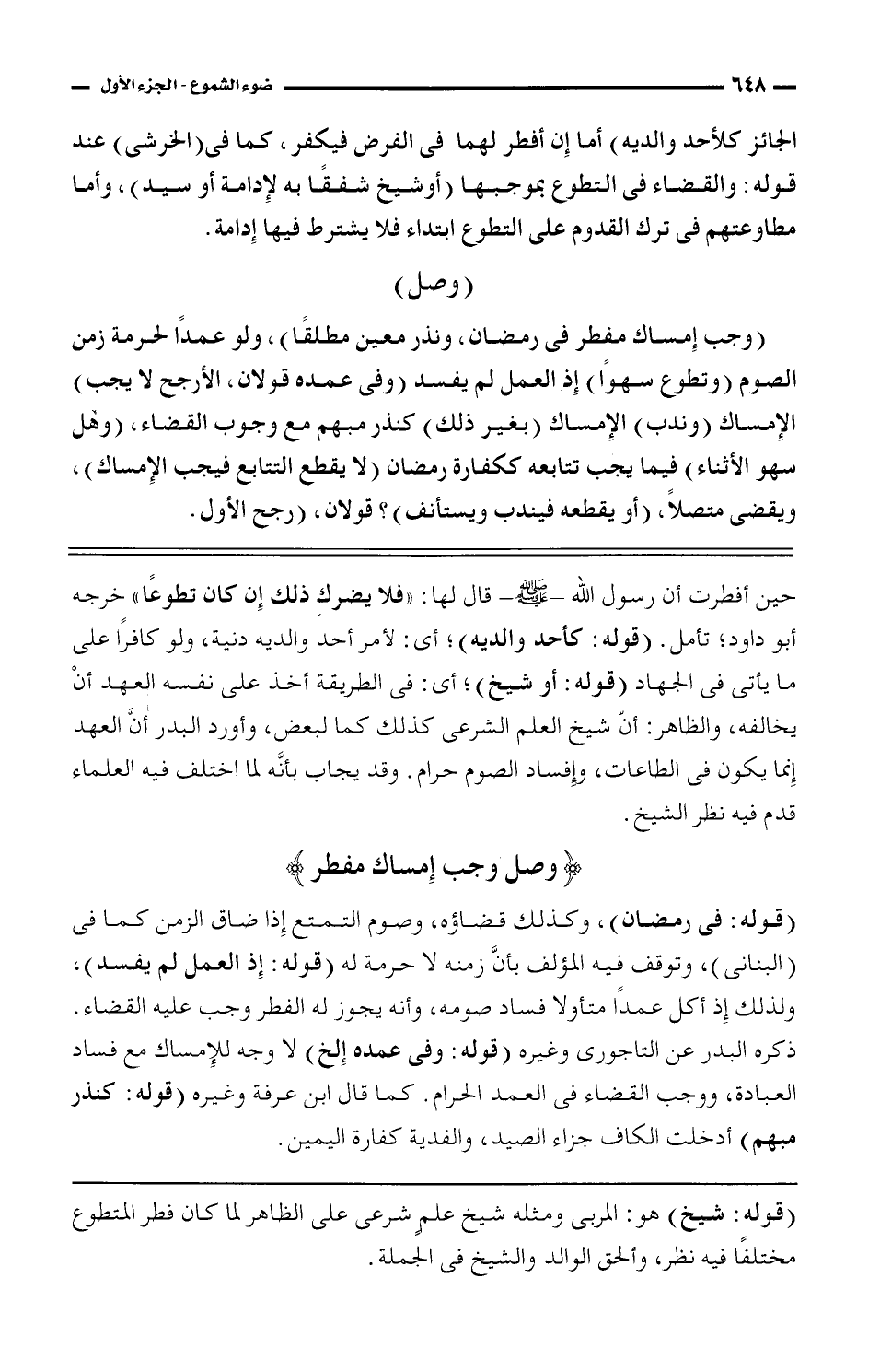 حين أفطرت أن رسول الله- صلى الله عليه وسلم- قال لها: ((فلا يضرك ذلك إن كان تطوعًا)) خرجه أبو داود؛ تأمل. (قوله: كأحد والديه)؛ أى: لأمر أحد والديه دنية، ولو كافرًا على ما يأتى فى الجهاد (قوله: أو شيخ)؛ أى: فى الطريقة أخذ على نفسه العهد أن يخالفه، والظاهر: أنّ شيخ العلم الشرعى كذلك كما لبعض، وأورد البدر أنَّ العهد إنما يكون فى الطاعات، وإفساد الصوم حرام. وقد يجاب بأنَّه لما اختلف فيه العلماء قدم فيه نظر الشيخ.