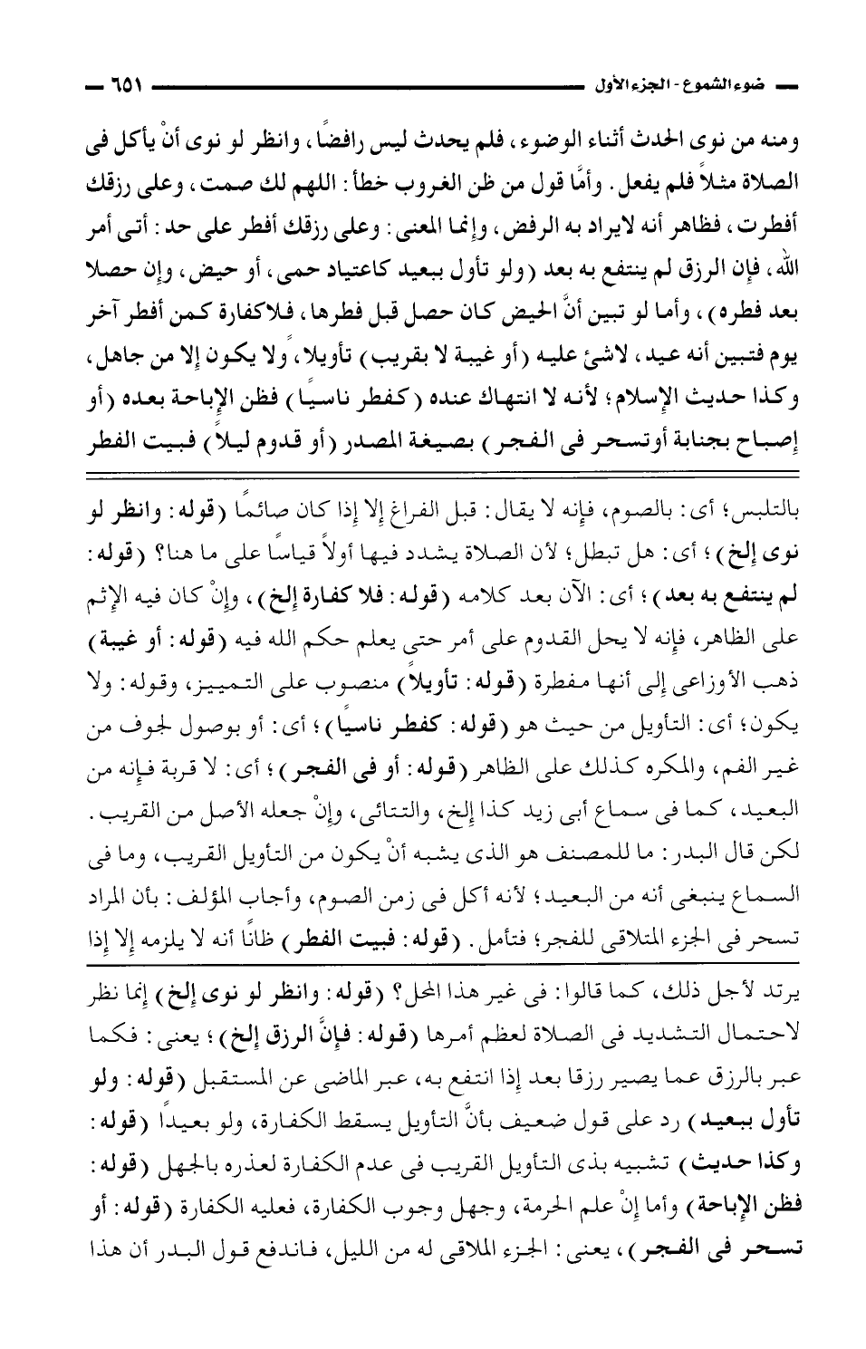 بالتلبس؛ أي: بالصوم، فانه لا يقال: قبل الفراغ إلا إذا كان صائمًا (قوله: وانظر لو نوى إلخ)؛ أي: هل تبصل؛ لأن الصلاة يشدد فيها أولًا قياسًا على ما هنا؟ (قوله: لم ينتفع به بعد)؛ أي: الآن بعد كلامه (قوله: فلا كفارة إلخ)، وإن كان فيه الإثم على الظاهر، فإنه لا يحل القدوم على أمر حتى يعلم حكم الله فيه (قوله: أو غيبة) ذهب الأوزاعي إلى أنها مفطرة (قوله: تأويلًا) منصوب على التمييز، وقوله: ولا يكون؛ أي: التأويل من حيث هو (قوله: كفطر ناسيًا)؛ أي: أو بوصول لجوف من غير الفم، والمكره كذلك على الظاهر (قوله: أو في الفجر)؛ أي: لا قربة فإنه من البعيد، كما في سماع أبي زيد كذا إلخ، والتتائي، وإن جعله الأصل من القريب. لكن قال البدر: ما للمصنف هو الذي يشبه أن يكون من التأويل القريب، وما في السماع ينبغي أنه من البعيد؛ لأنه أك في زمن الصوم، وأجاب المؤلف: بأن المراد تسحر في الجزء المتلاقي للفجر؛ فتأمل. (قوله: فبيت الفطر) ظانًا أنه لا يلزمه إلا إذا