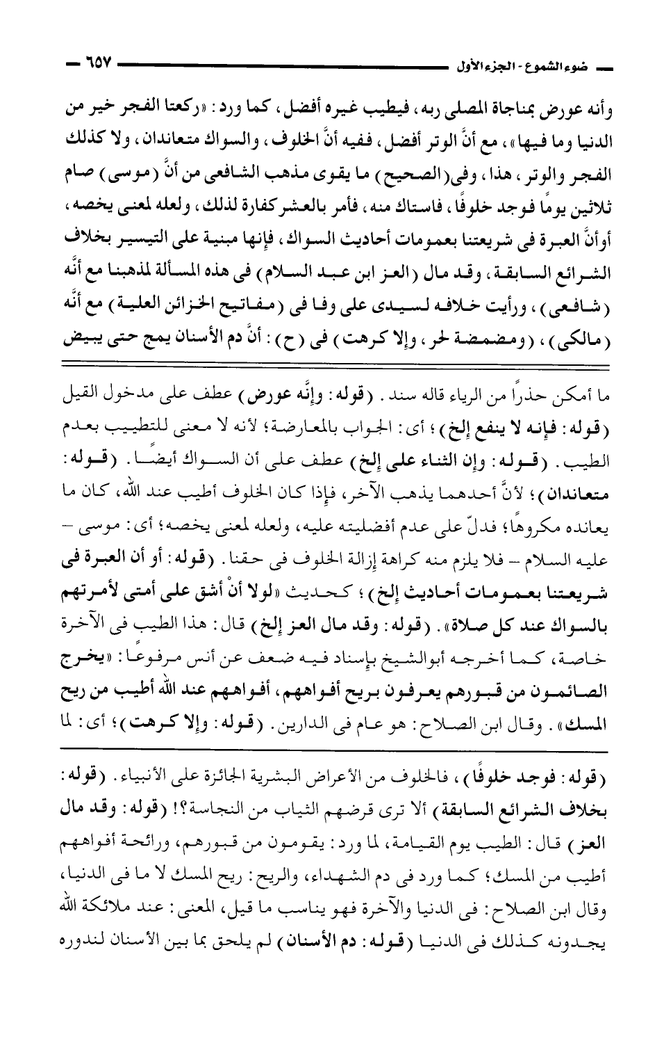 وأنه عورض بمناجاة المصلي ربه، فيطيب غيره أفضل، كما ورد: (ركعتا الفجر خير من الدنيا وما فيها)، مع أنَّ الوتر أفضل، ففيه أنَّ الخلوف، والسواك متعاندان، ولا كذلك الفجر والتور، وهذا، وفي (الصحيح) ما يقوى مذهب الشافعي من أنَّ (موسى) صام ثلاثين يومًا فوجد خلوفًا، فاستاك منه، فأمر بالعشر كفارة لذلك، ولعله لمعنى يخصه، أو أنَّ العبرة في شريعتنا بعمومات أحاديث السواك، فإنها مبنية على التيسير بخلاف الشرائع السابقة، وقد مال (العز ابن عبد السلام) في هذه المسالة لمذهبنا مع انَّه (شافعي)، ورأيت خلافه لسيدي على وفا في (مفاتيح الخزائن العلية) مع أنَّه (مالكي)، (ومضمضة لحر، وإلا كرهت) في (ح): أنَّ دم الأسنان حتى يبيض