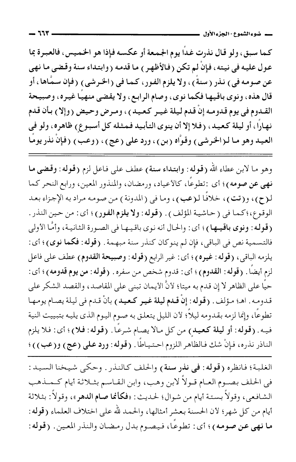 كما سبق، ولو قال نذرت غدًا يوم الجمعة أو عكسه فإذا هو الخميس، فالعبرة بما عول عليه في نيته، فإن لم تكن (فالأظهر) ما قدمه (وابتداء سنة وقضي ما نهى عن صومه في) نذر (سنةً)، ولا يلزم الفور، كما في (الخرشي) (فإن سمَّاها، أو قال هذه، ونوى باقيها فكما نوى، وصام الرابع، ولا يقضي منهيًا غيره، وصبيحة القدوم في يوم قدومه إن قدم ليلة غير كعيد)، ومرض وحيض (وإلا) بأن قدم نهارًا، أو ليلة كعيد، (فلا إلا أن ينوي التأبيد فمثله كل اسبوعٍ) ظاهره، ولو في العيد وهو ما ل (الخرشي) وقوَّاه (بن)، ورد على (عج)، (وعب) (فإن نذر يومًا