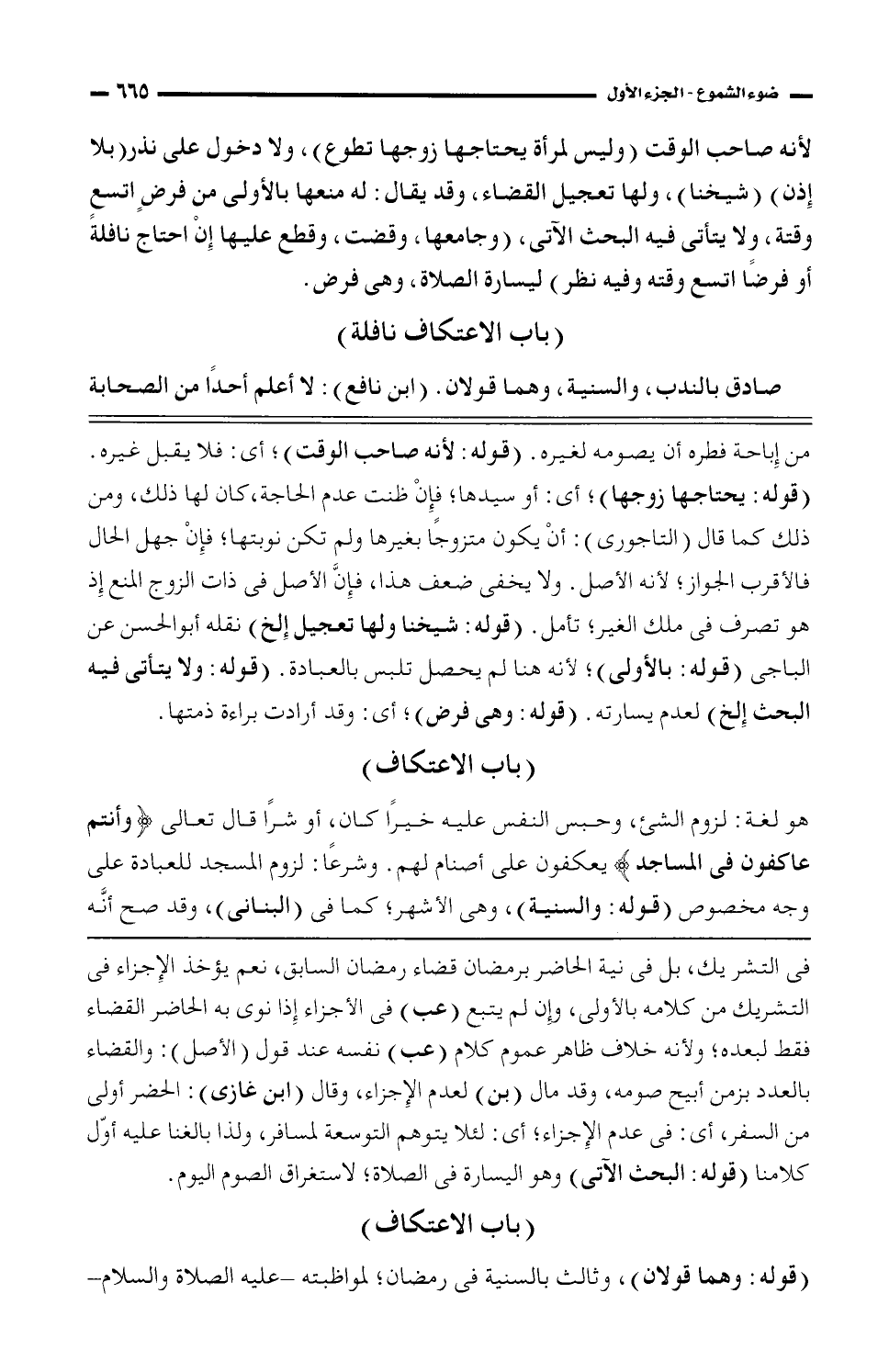 هو لغة: لزوم الشيء، وحبس النفس عليه خيرًا كان، أو شرًا قال تعالى {وأنتم عاكفون في المساجد} يعكفون على أصنام لهم. وشرعًا: لزوم المسجد للعبادة على وجه مخصوص (قوله: والسنية)، وهي الأشهر؛ كما في (البنياني)، وقد صح أنَّه