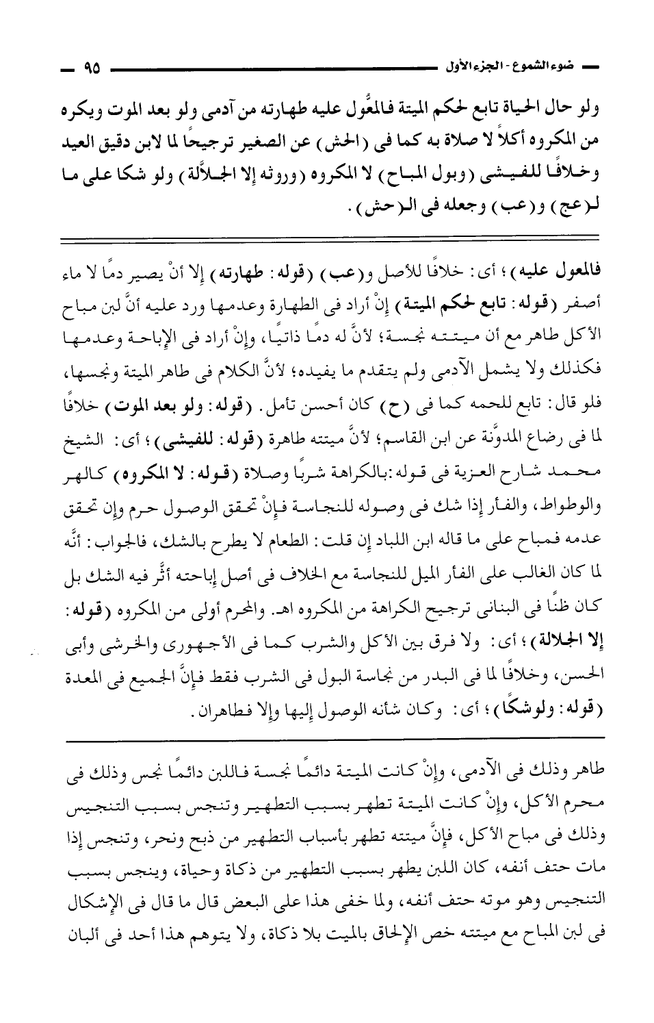 طاهر وذلك فى الآدمى، وإن كانت الميتة دائمًا نجسة فاللبن دائمًا نجس وذلك فى محرم الأكل، وإن كانت الميتة تطهر بسبب التطهير وتنجس بسبب التنجيس وذلك فى مباح الأكل، فإنَّ ميتته تطهر بأسباب التطهير من ذبح ونحر، وتنجس إذا مات حتف أنفه، كان اللبن يطهر بسبب التطهير من ذكاة وحياة، وينجس بسبب التنجيس وهو موته حتف أنفه، ولما خفى هذا على البعض قال ما قال فى الإشكال فى لبن المباح مع ميتته خص الإلحاق بالميت بلا ذكاة، ولا يتوهم هذا أحد فى ألبان
