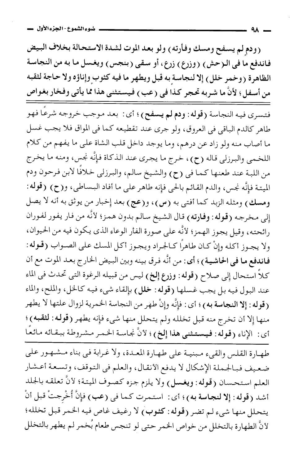 فتسرى فيه النجاسة (قوله: ودم لم يسفح)؛ أى: بعد موجب خروجه شرعًا فهو طاهر كالدم الباقى فى العروق، ولو جرى عند تقطيعه كما فى المواق فلا يجب غسل ما أصاب منه ولو زاد عن درهم، وما يوجد داخل قلب الشاة على ما يفهم من كلام اللخمى والبرزلى قاله (ح)، خرج ما يجرى عند الذكاة فإنَّه نجس، ومنه ما يخرج من اللبة عند طعنها كما فى (ح) والشيخ سالم، والبرزلى خلافًا لابن فرحون ودم الميتة فإنَّه نجس، والدم القائم بالحى فإنه طاهر على ما أفاد البساطى، و (ح) (قوله: ومسك) ومثله الزبد كما أفتى به (س)، و (عج) بعد إخبار من يوثق به أنه لا يصل إلى مخرجه (قوله: وفارته) قال الشيخ سالم: بدون همز؛ لأنَّه من فار يفور لفوران رائحته، وقيل: يجوز الهمز؛ لأنَّه على صورة الفأر الوعاء الذى يكون فيه من الحيوان، ولا يجوز أكله وإن كان طاهرًا كالجراد ويجوز أكل المسك على الصواب (قوله: فاندفع ما فى الحاشية)؛ أى: من أنَّه فرق بينه وبين البيض الخارج بعد الموت مع أن كلًا استحال إلى صلاح (قوله: وزرع إلخ) ليس من قبيله الرغوة التى تحدث فى الماء عند البول فيه بل يجب غسلها (قوله: خلل) بإلقاء شيء فيه كالخل، والملح، والماء (قوله: إلا النجاسة به)، أى: فإنَّه وإن طهر من النجاسة الخمرية لزوال علتها لا يطهر منها إلا أن تخرج منه قبل تخلله ولم يتحلل منها شئ فإنه يطهر (قوله: لثقبه)؛ أى: الإناء (قوله: فيستثنى هذا إلخ)؛ لأنَّ نجاسة الخمر مشروطة ببقائه