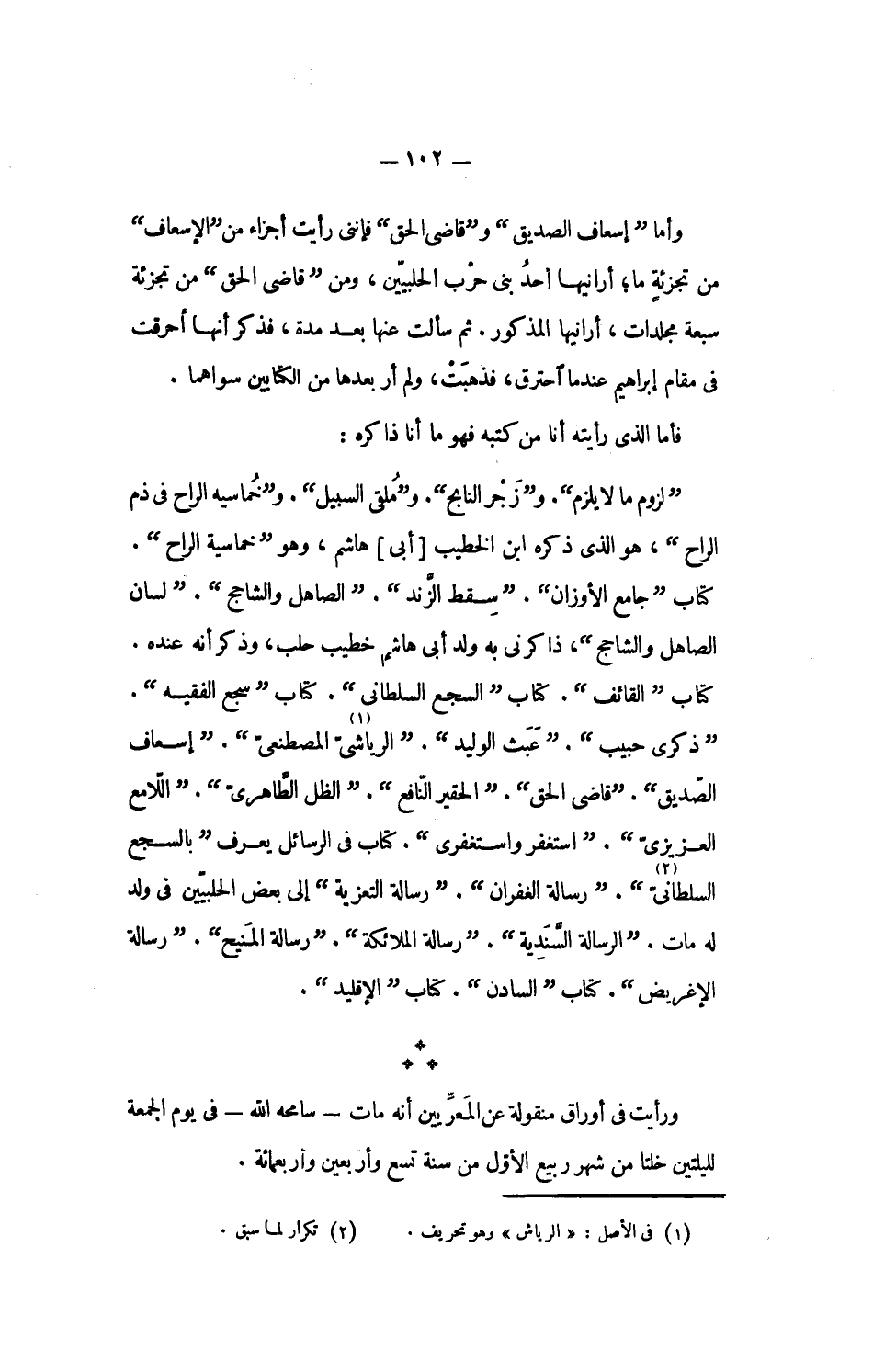 ذكرى حبيب. عبث الوليد. الرياشىّ «1» المصطنعىّ. إسعاف الصّديق. قاضى الحق. الحقير النّافع. الظل الطّاهرىّ. اللّامع العزيزىّ. استغفر واستغفرى. كتاب فى الرسائل يعرف بالسجع السلطانى «2». رسالة الغفران. رسالة التعزية إلى بعض الحلبيّين فى ولد له مات. الرسالة السّندية. رسالة الملائكة. رسالة المنيح. رسالة الإغريض. كتاب السادن. كتاب الإقليد.