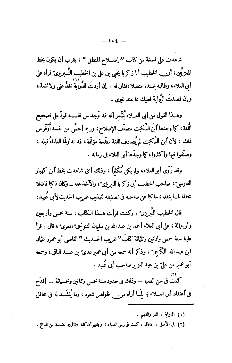شاهدت على نسخة من كتاب إصلاح المنطق، يقرب أن يكون بخط المعرّيين، أن الخطيب أبا زكريا يحيى بن على بن الخطيب التّبريزىّ قرأه على أبى العلاء، وطالبه بسنده متصلا، فقال له: إن أردت الدّراية «1» فخذ عنى ولا تتعدّ، وإن قصدت الرّواية فعليك بما عند غيرى.