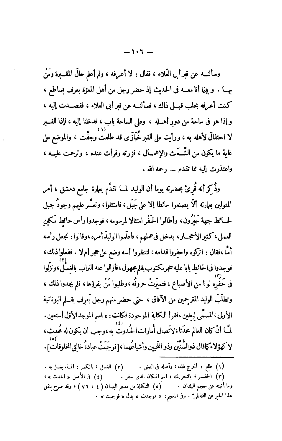 وسألته عن قبر أبى العلاء، فقال: لا أعرفه، ولم أعلم حال المقبره ومن بها. وبينما أنا معه فى الحديث إذ حضر رجل من أهل المعرّة يعرف بساطع، كنت أعرفه بحلب قبل ذاك، فسألته عن قبر أبى العلاء، فقصدت إليه، وإذا هو فى ساحة من دور أهله، وعلى الساحة باب، فدخلنا إليه، فإذا القبر لا احتفال لأهله به، ورأيت على القبر خبّازى قد طلعت «1» وجفّت، والموضع على غاية ما يكون من الشّعث والإهمال، فزرته وقرأت عنده، وترحمت عليه، واعتذرت إليه مما تقدم- رحمه الله.