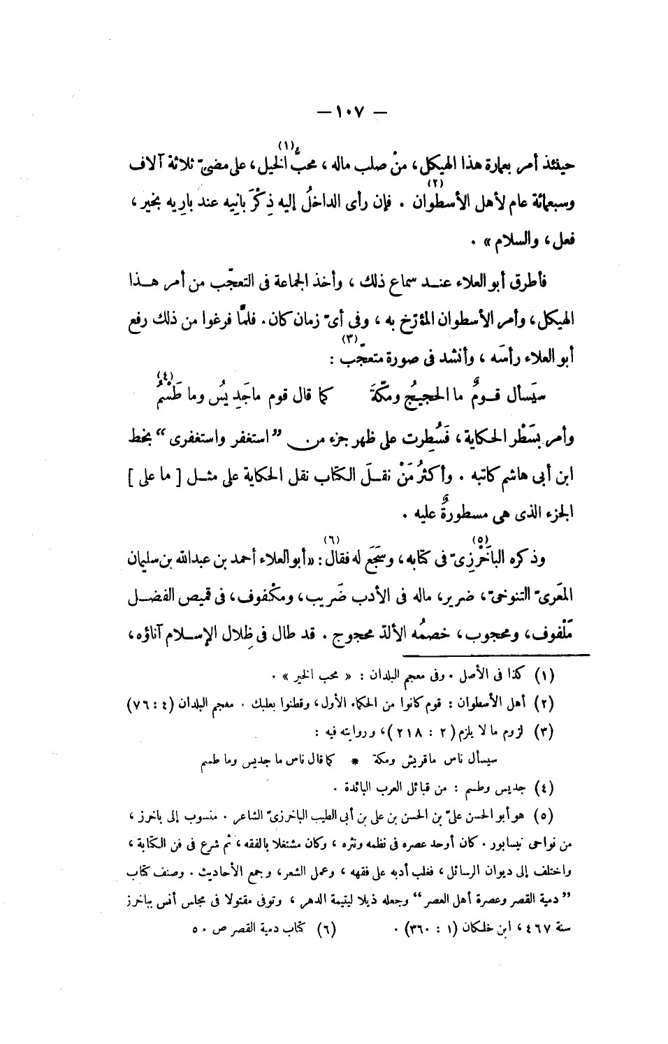 فأطرق أبو العلاء عند سماع ذلك، وأخذ الجماعة فى التعجّب من أمر هذا الهيكل، وأمر الأسطوان المؤرّخ به، وفى أىّ زمان كان. فلمّا فرغوا من ذلك رفع أبو العلاء رأسه، وأنشد فى صورة متعجّب: «3»