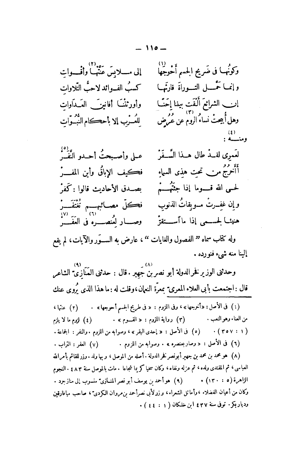 وحدثنى الوزير فخر الدولة أبو نصر بن «8» جهير. قال: حدثنى المنازىّ «9» الشاعر قال: اجتمعت بأبى العلاء المعرىّ بمعرّة النعمان، وقلت له: ما هذا الذى يروى عنك