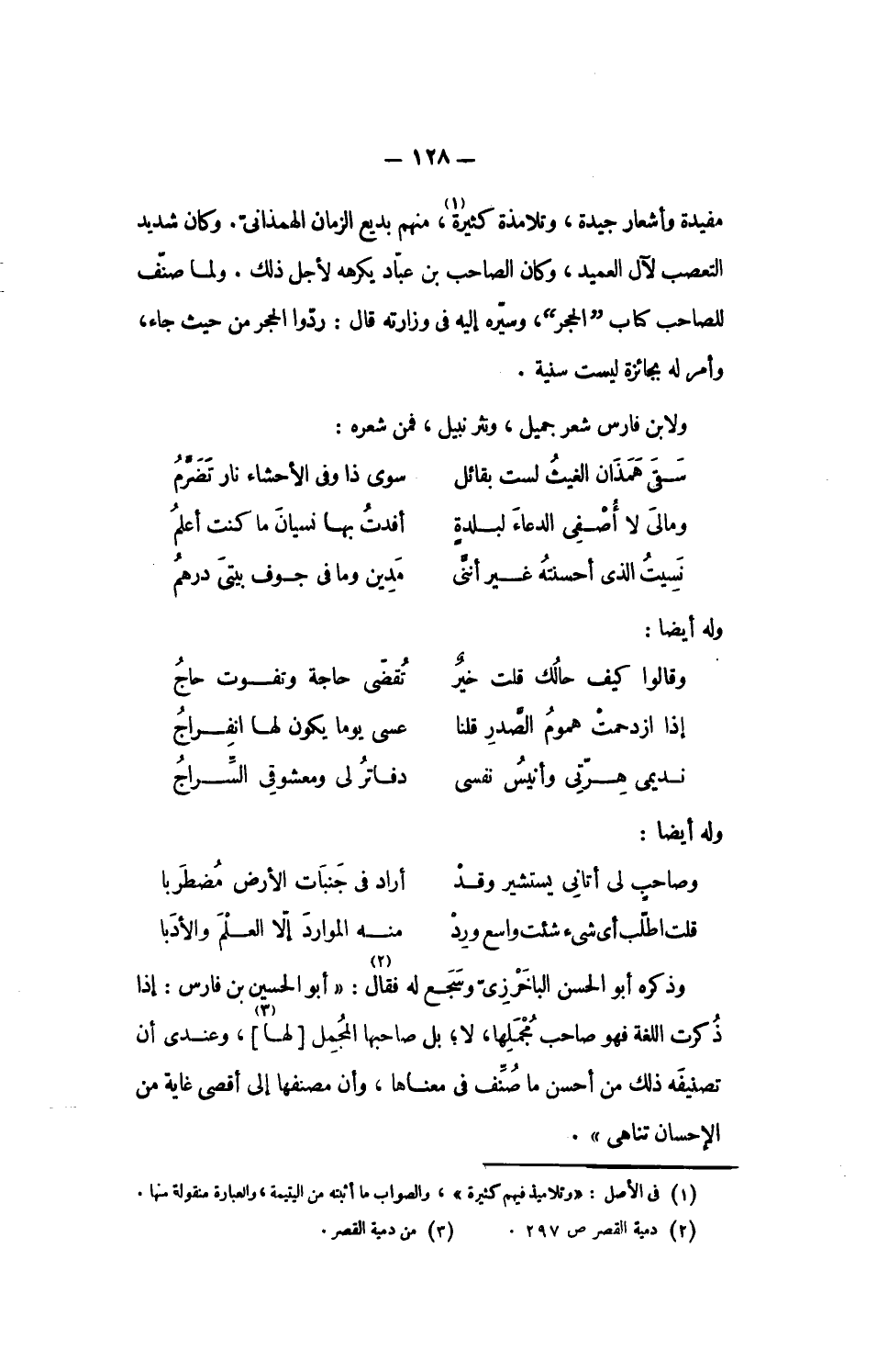 وذكره أبو الحسن الباخرزىّ وسجع له فقال: «2» «أبو الحسين بن فارس: إذا ذكرت اللغة فهو صاحب مجملها، لا؛ بل صاحبها المجمل [لها] «3»، وعندى أن تصنيفه ذلك من أحسن ما صنّف فى معناها، وأن مصنفها إلى أقصى غاية من الإحسان تناهى».