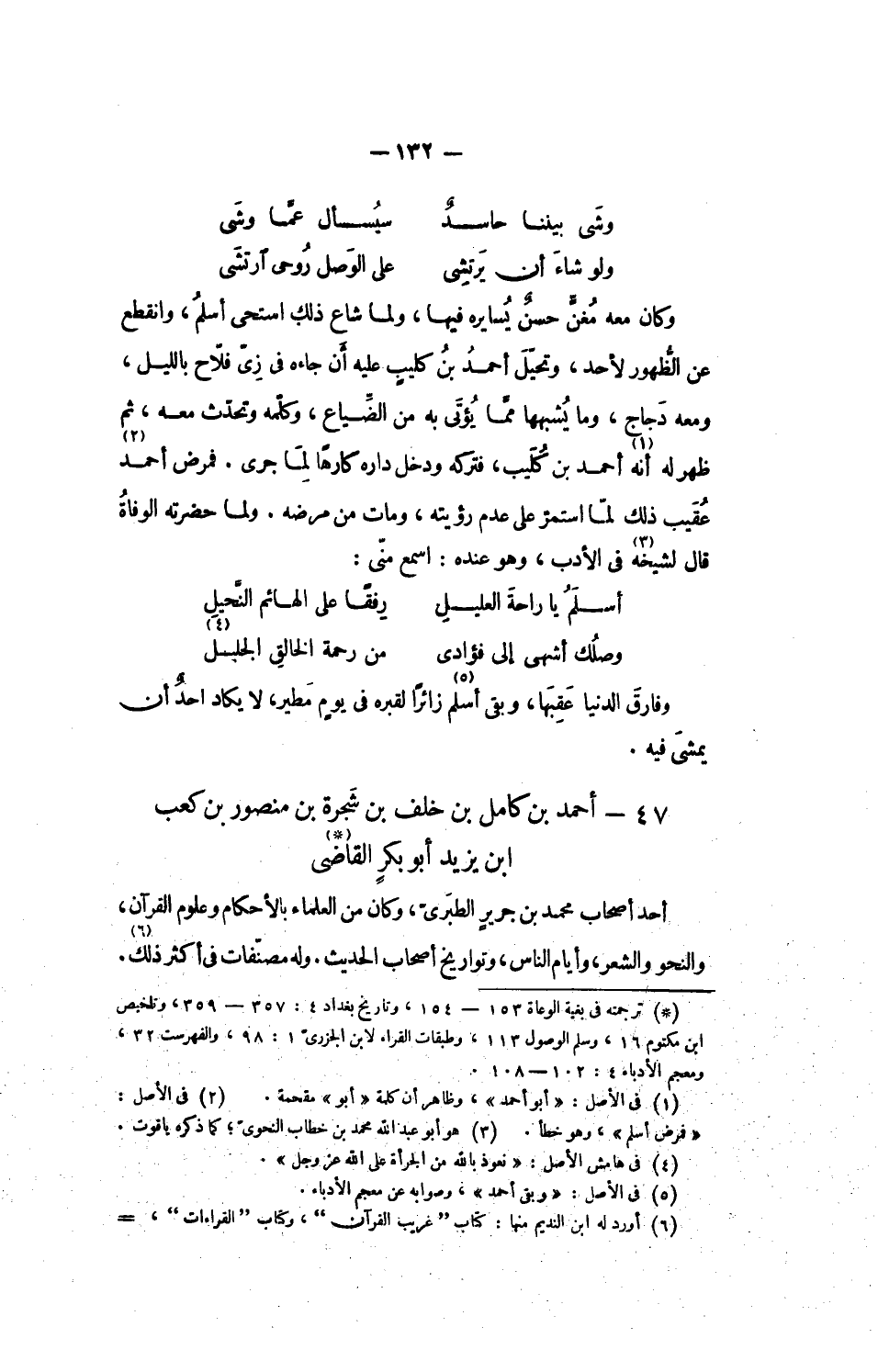 وكان معه مغنّ حسن يسايره فيها، ولما شاع ذلك استحى أسلم، وانقطع عن الظّهور لأحد، وتحيّل أحمد بن كليب عليه أن جاءه فى زىّ فلّاح بالليل، ومعه دجاج، وما يشبهها ممّا يؤتى به من الضّياع، وكلّمه وتحدّث معه، ثم ظهر له أنه «1» أحمد بن كليب، فتركه ودخل داره كارها لما جرى. فمرض أحمد «2» عقيب ذلك لمّا استمرّ على عدم رؤيته، ومات من مرضه. ولما حضرته الوفاة قال لشيخه «3» فى الأدب، وهو عنده: اسمع منّى: