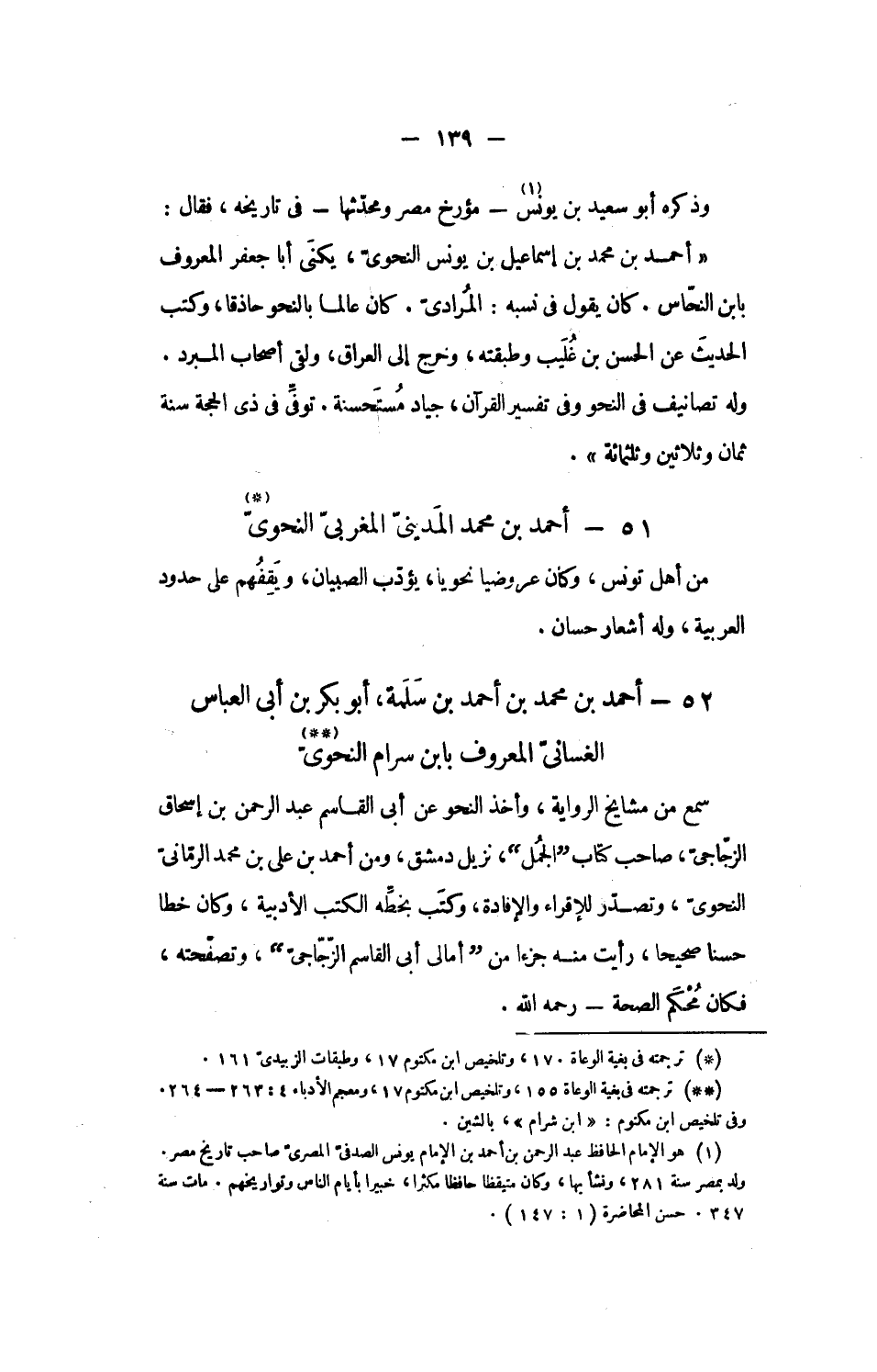 «أحمد بن محمد بن إسماعيل بن يونس النحوىّ، يكنى أبا جعفر المعروف بابن النحّاس. كان يقول فى نسبه: المرادىّ. كان عالما بالنحو حاذقا، وكتب الحديث عن الحسن بن غليب وطبقته، وخرج إلى العراق، ولقى أصحاب المبرد.