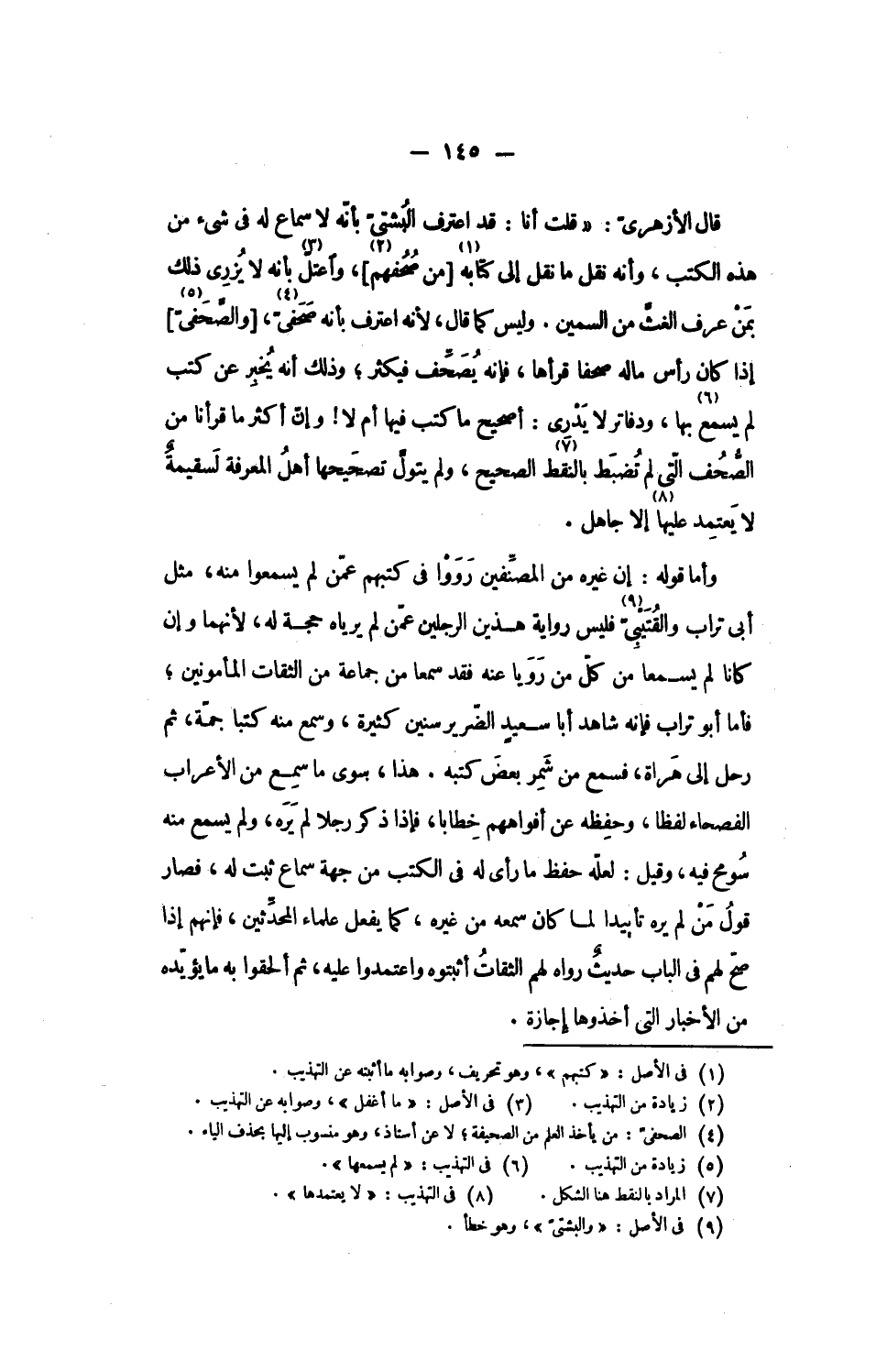 قال الأزهرىّ: «قلت أنا: قد اعترف البشتىّ بأنّه لا سماع له فى شىء من هذه الكتب، وأنه نقل ما نقل إلى كتابه «1» [من صحفهم «2»]، واعتلّ «3» بأنه لا يزرى ذلك بمن عرف الغثّ من السمين. وليس كما قال، لأنه اعترف بأنه صحفىّ، «4» [والصّحفىّ] «5» إذا كان رأس ماله صحفا قرأها، فإنه يصحّف فيكثر؛ وذلك أنه يخبر عن كتب لم يسمع «6» بها، ودفاتر لا يدرى: أصحيح ما كتب فيها أم لا! وإنّ أكثر ما قرأنا من الصّحف الّتى لم تضبط بالنقط «7» الصحيح، ولم يتولّ تصحيحها أهل المعرفة لسقيمة لا يعتمد عليها «8» إلا جاهل.