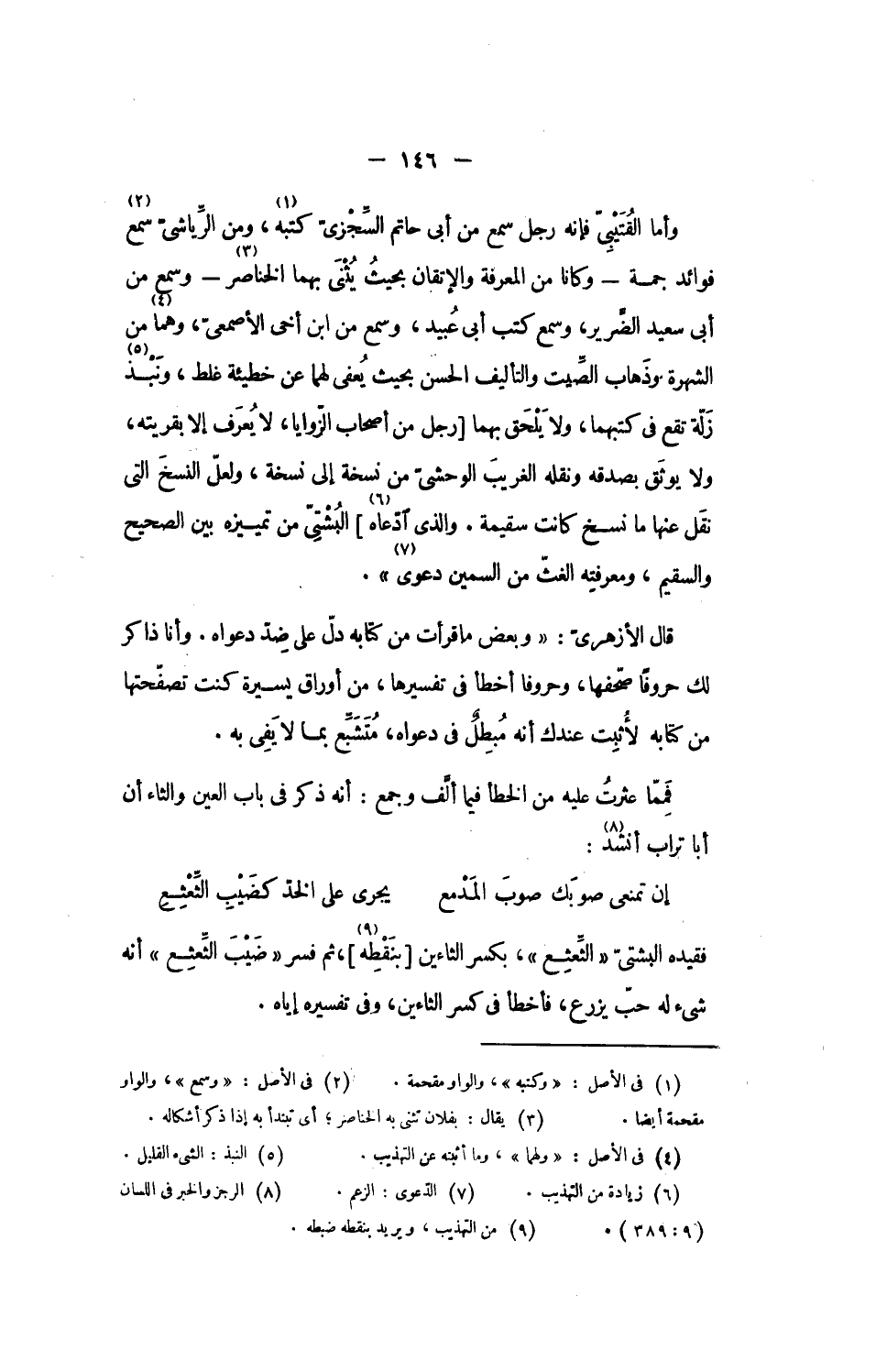 فممّا عثرت عليه من الخطأ فيما ألّف وجمع: أنه ذكر فى باب العين والثاء أن أبا تراب أنشد: «8»